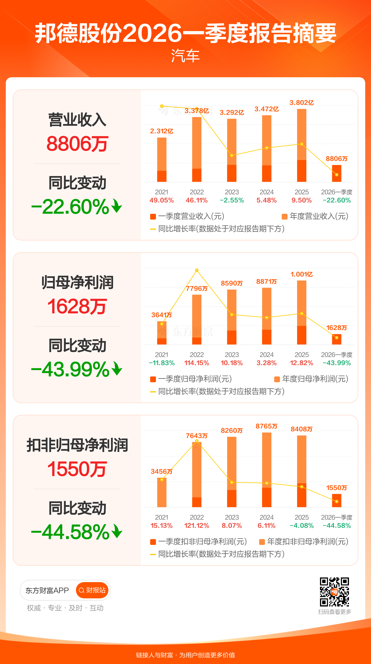 邦德股份4月23日发布2026年一季报显示,公司一季度实现营业收入8805.81万元,同比下滑22.60%;归母净利润1627.92万元,同比下滑43.99%;扣非归母净利润1549.57万元,同比下滑44.58%。