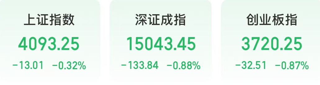 今天,A股震荡调整。截至收盘,上证指数下跌0.32%,深证成指下跌0.88%,创业板指下跌0.87%。