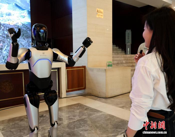 参会嘉宾在现场与人形机器人互动。赵晓摄