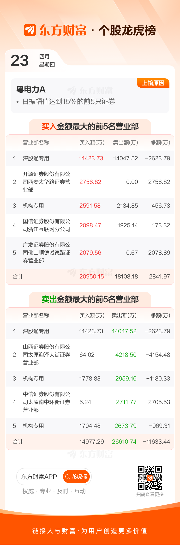 交易所2026年4月23日公布的交易公开信息显示,粤电力A因成为日振幅值达到15%的前5只证券、连续三个交易日内,涨幅偏离值累计达到20%的证券上榜。粤电力A当日收报7.15元,涨跌幅9.16%,偏离值15.92%,换手率11.73%,成交额20.22亿。异常期间4月21日至4月23日,期间涨幅23.06%,累计偏离值23.16%,区间成交额45.26亿。