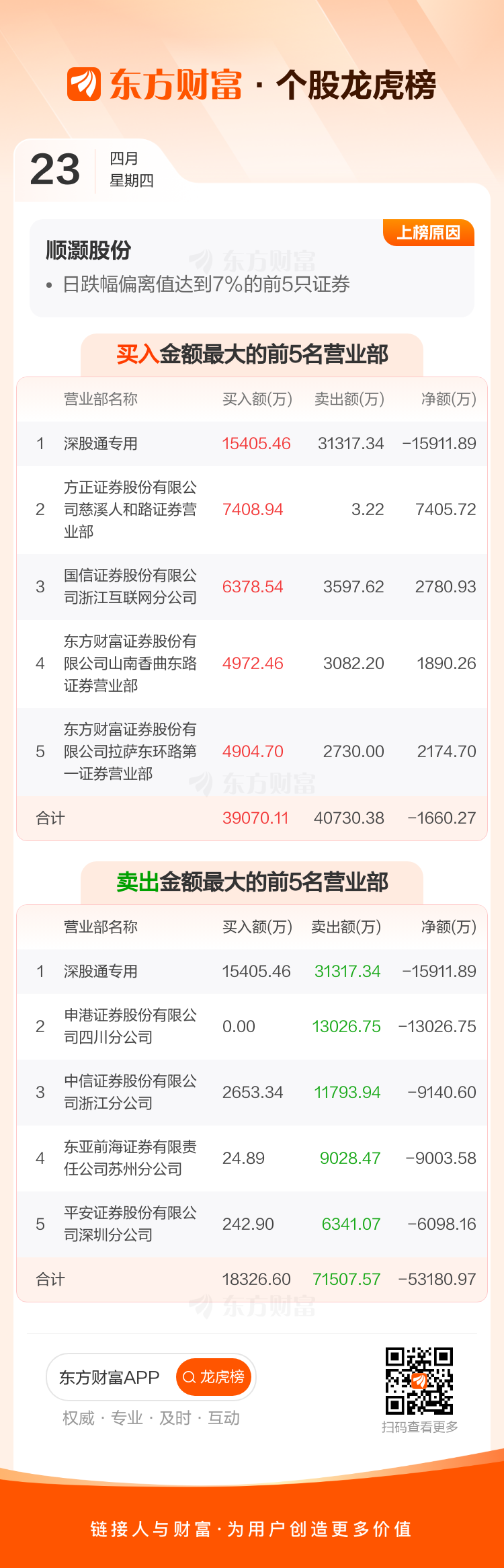 交易所2026年4月23日公布的交易公开信息显示,顺灏股份因成为日跌幅偏离值达到7%的前5只证券上榜。顺灏股份当日收报19.76元,涨跌幅-9.98%,偏离值-8.95%,换手率25.18%,成交额54.56亿。