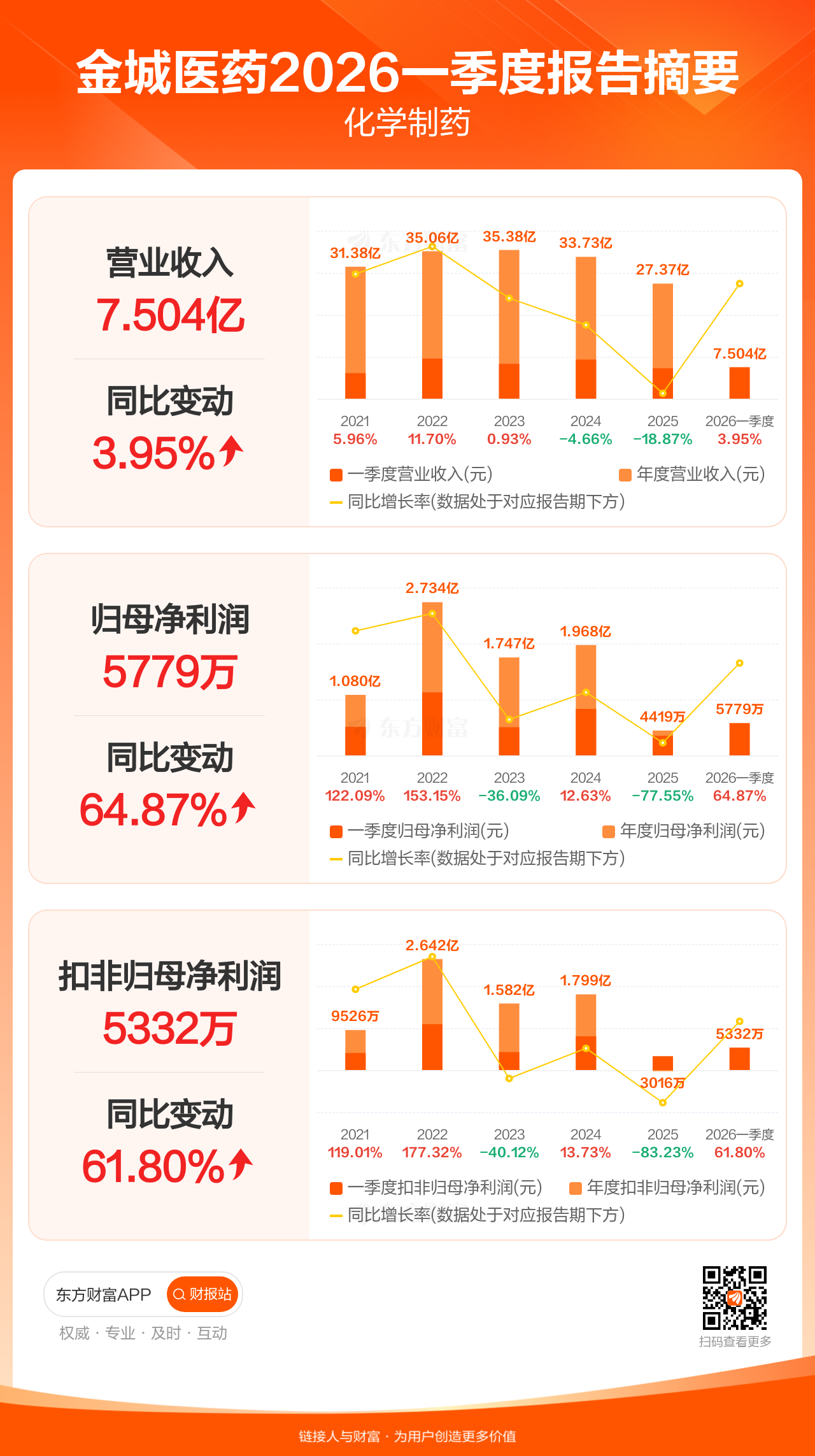 金城医药4月24日发布2026年一季报显示,公司一季度实现营业收入7.50亿元,同比增长3.95%;归母净利润5779.45万元,同比增长64.87%;扣非归母净利润5331.59万元,同比增长61.80%。