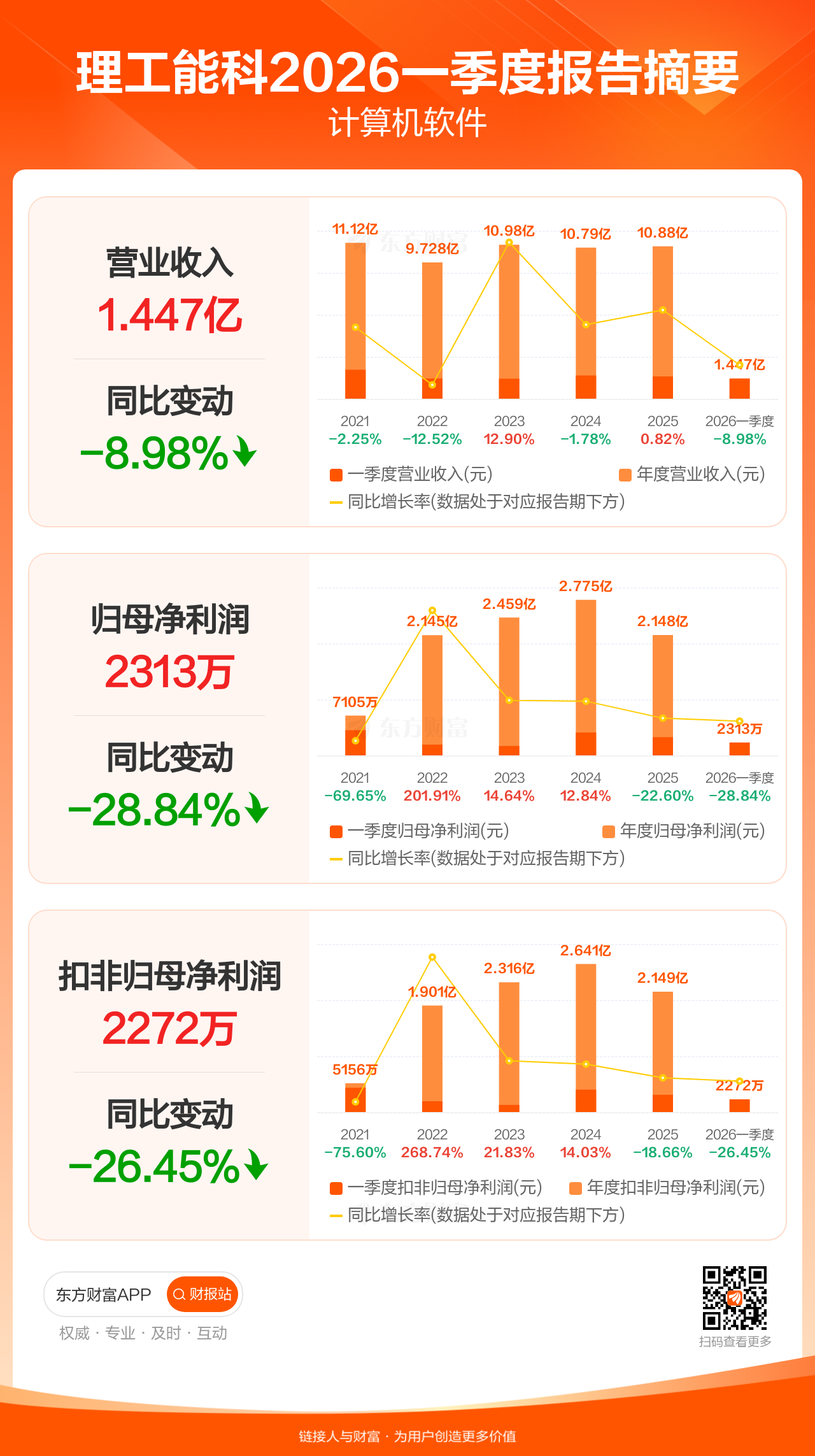理工能科4月24日发布2026年一季报显示,公司一季度实现营业收入1.45亿元,同比下滑8.98%;归母净利润2312.77万元,同比下滑28.84%;扣非归母净利润2271.74万元,同比下滑26.45%。