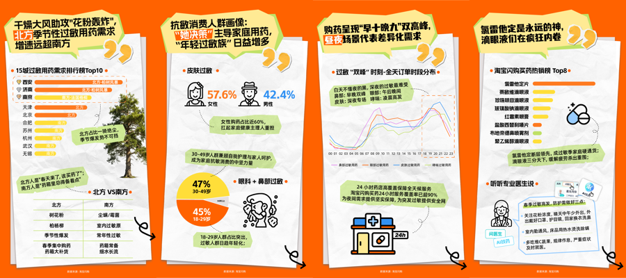 用药习惯上,过敏用药呈现出“早十晚九”的典型昼夜节律:眼部抗过敏药早间需求旺盛,鼻部用药集中在上午、午后时段,皮肤护理药以及哮喘等支气管类过敏病症则在深夜刚需突出,抗过敏口服药以氯雷他定为代表,晚间20点-21点呈现全天用药高峰。淘宝闪购夜间22点-次日8点的订单占比达21%,买药最快19分钟送达,24小时看病买药服务为过敏人士提供了极大便利。