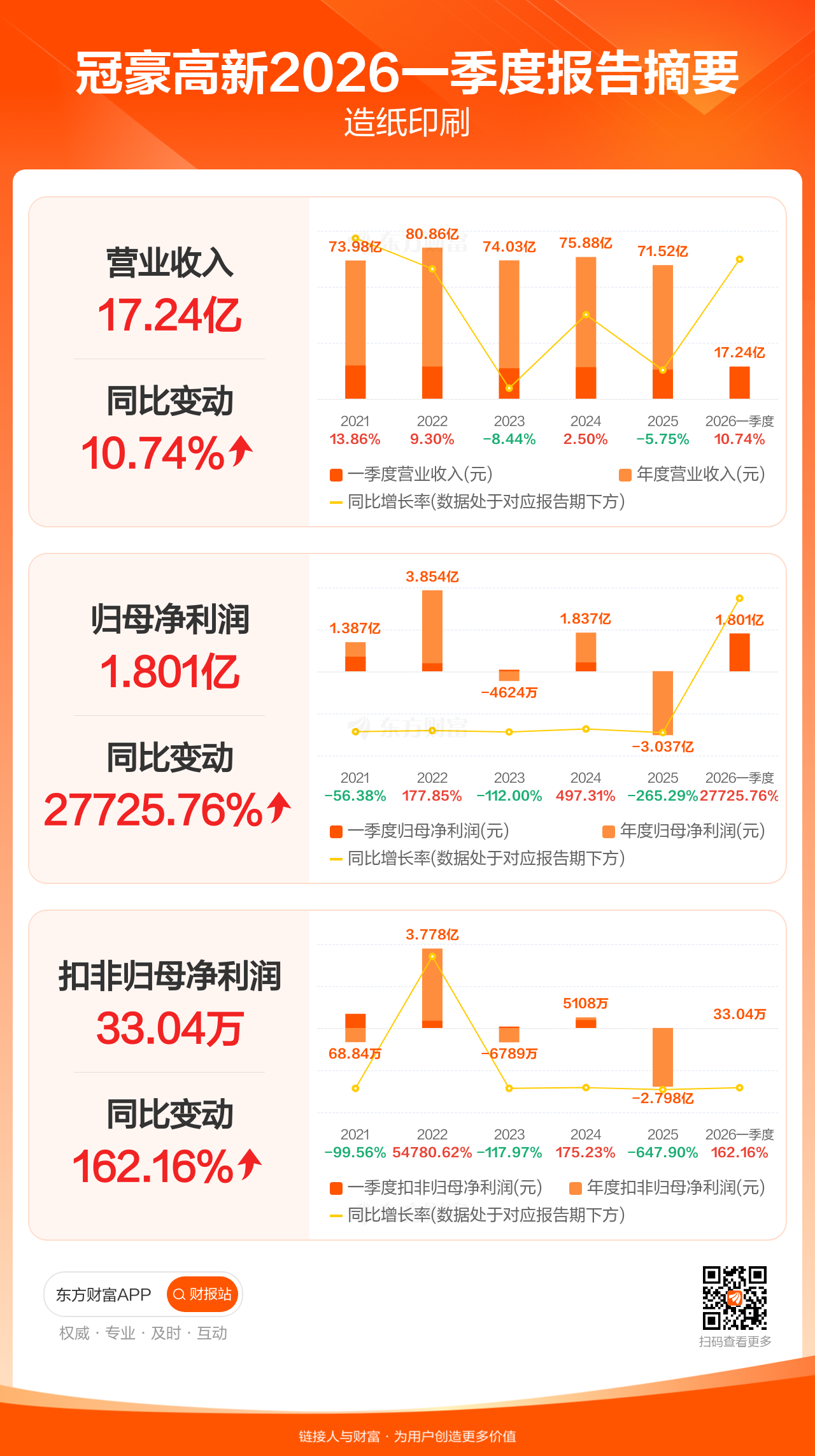 冠豪高新4月24日发布2026年一季报显示,公司一季度实现营业收入17.24亿元,同比增长10.74%;归母净利润1.80亿元,同比增长27725.76%;扣非归母净利润33.04万元,同比增长162.16%。