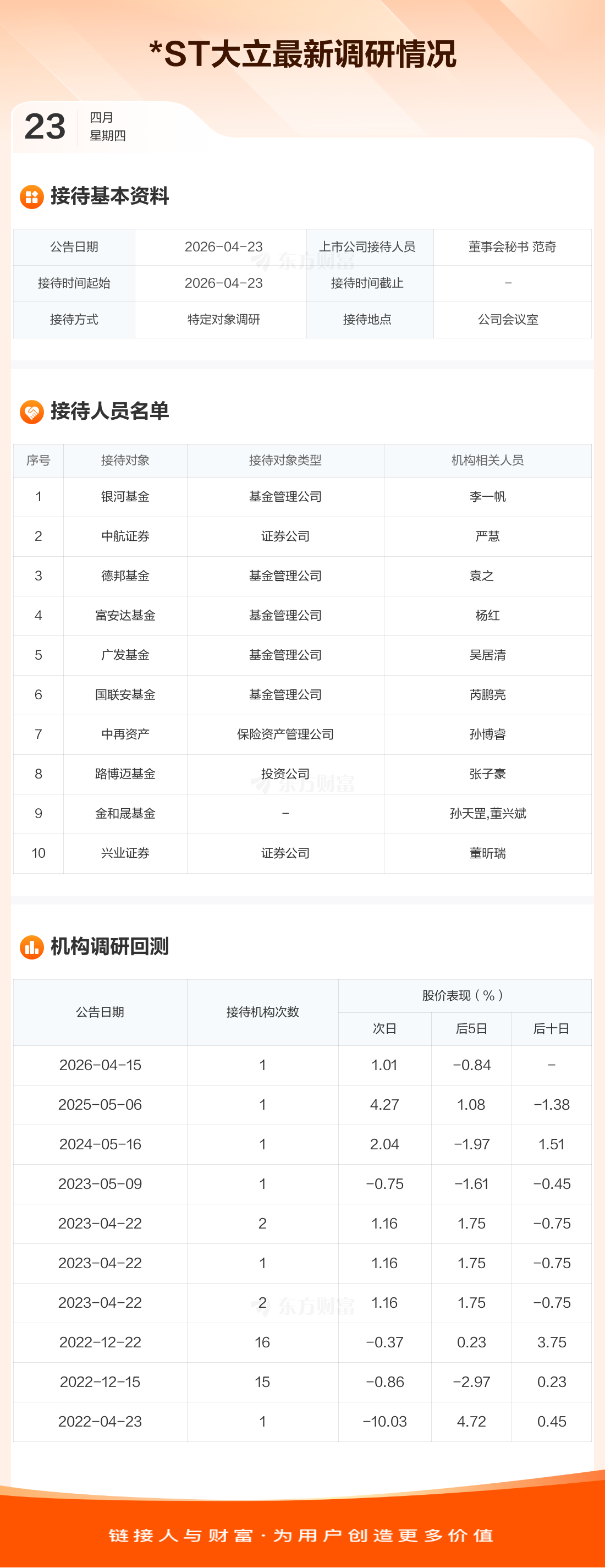 *ST大立4月23日公告称,4月23日接待银河基金等10家机构调研。接待人员包括董事会秘书 范奇。