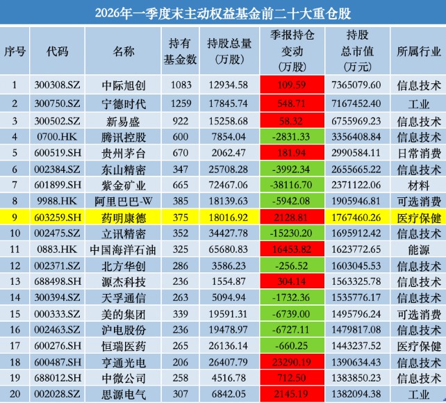 截至4月23日,公募基金2026年一季度报告已全部披露完毕。据Wind数据统计,中际旭创(300308.SZ)、宁德时代(300750.SZ)、新易盛(300502.SZ)稳坐主动权益基金(包括普通股票型基金、偏股混合型基金、平衡混合型基金、灵活配置型基金)的前三大重仓股。