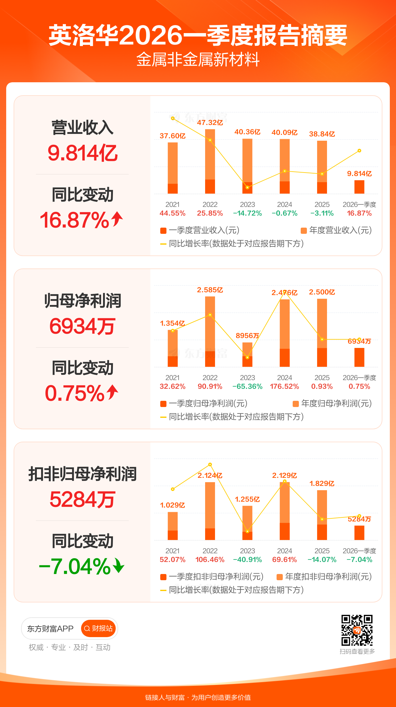 英洛华4月24日发布2026年一季报显示,公司一季度实现营业收入9.81亿元,同比增长16.87%;归母净利润6933.72万元,同比增长0.75%;扣非归母净利润5283.64万元,同比下滑7.04%。