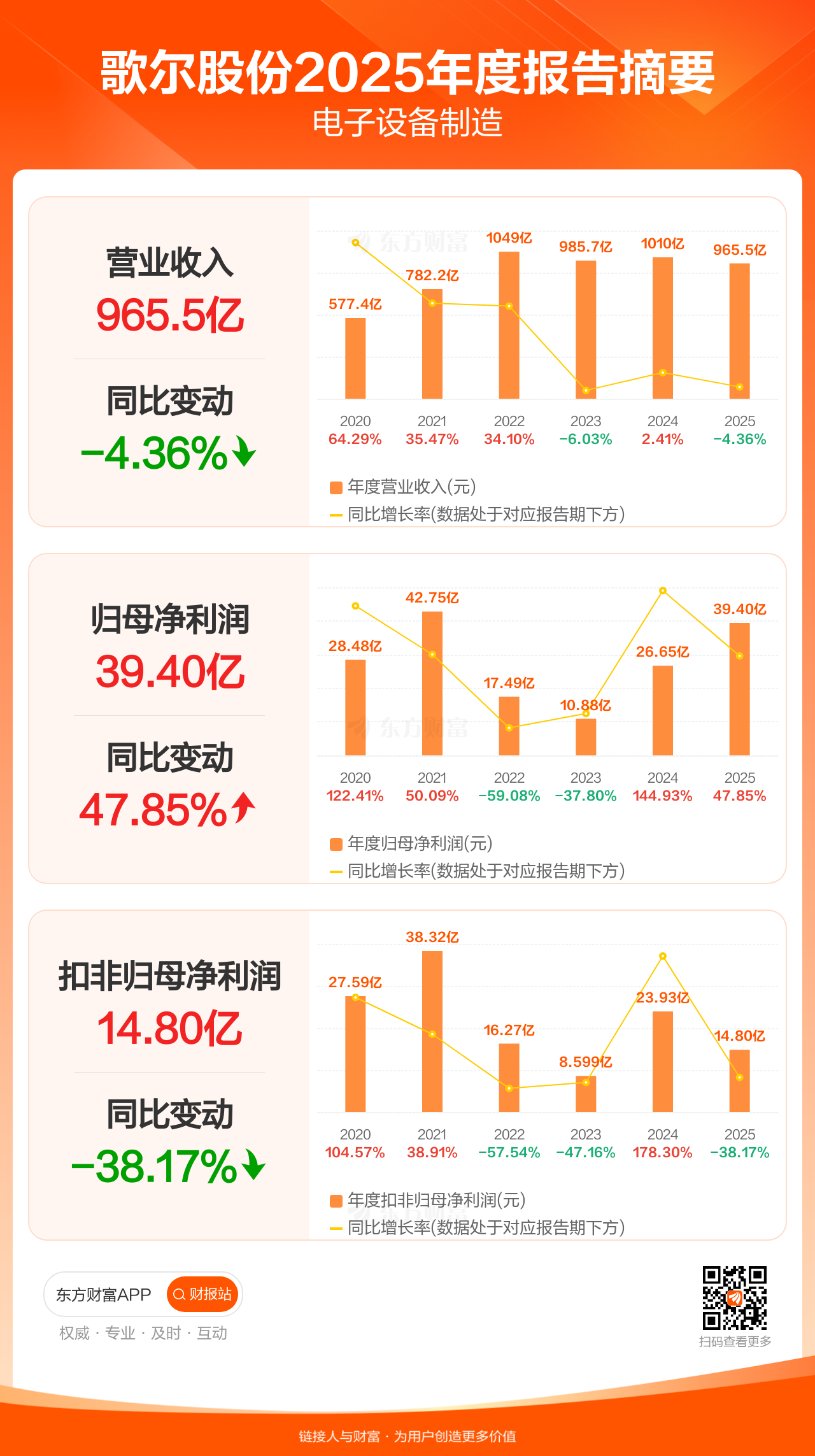 歌尔股份4月24日发布2025年年报显示,公司全年实现营业收入965.50亿元,同比下滑4.36%;归母净利润39.40亿元,同比增长47.85%;扣非归母净利润14.80亿元,同比下滑38.17%。