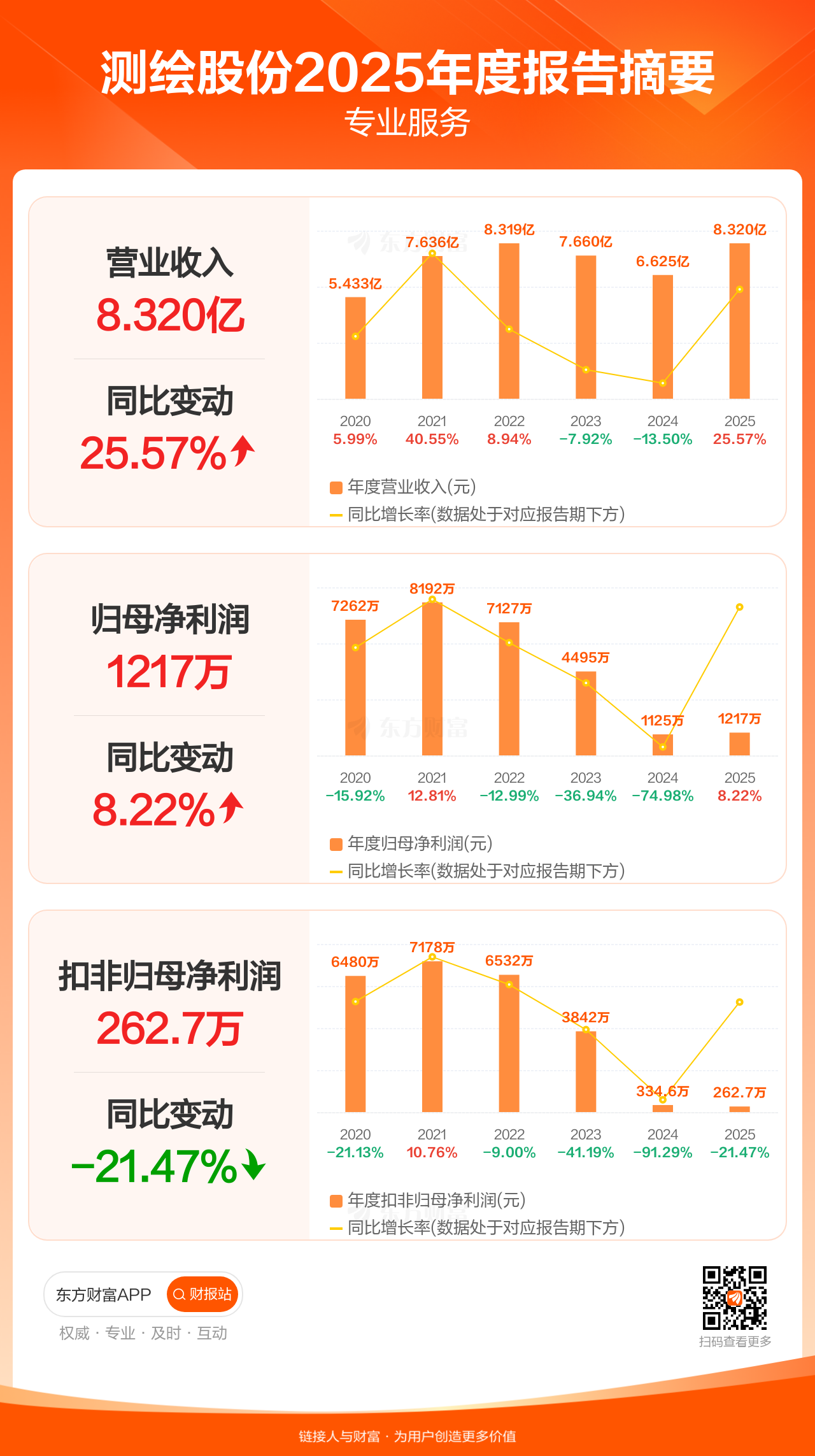 测绘股份4月24日发布2025年年报显示,公司全年实现营业收入8.32亿元,同比增长25.57%;归母净利润1217.17万元,同比增长8.22%;扣非归母净利润262.73万元,同比下滑21.47%。
