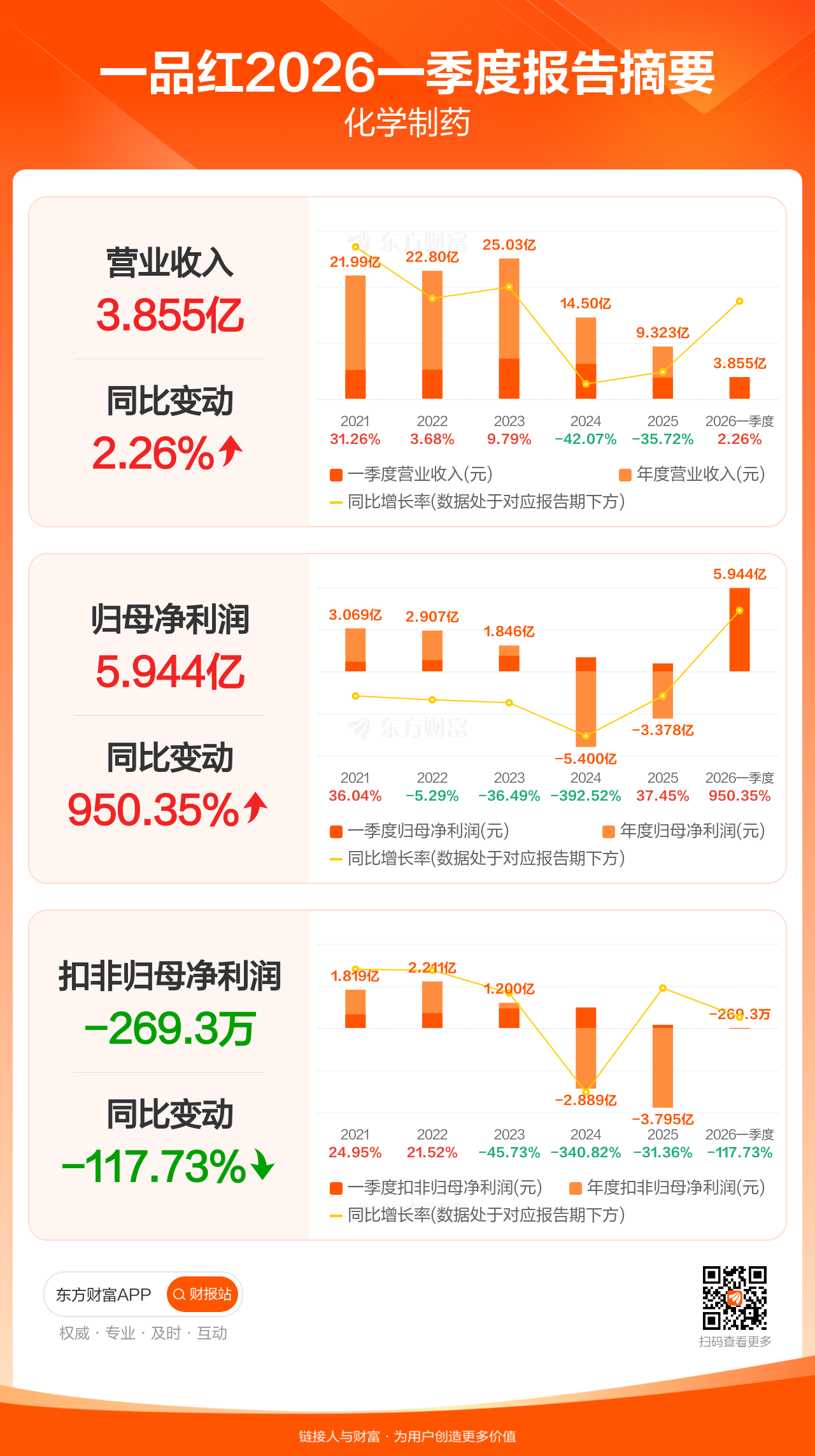 一品红4月24日发布2026年一季报显示,公司一季度实现营业收入3.85亿元,同比增长2.26%;归母净利润5.94亿元,同比增长950.35%;扣非归母净利润-269.32万元。