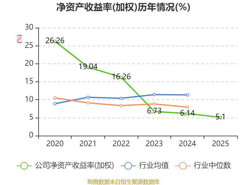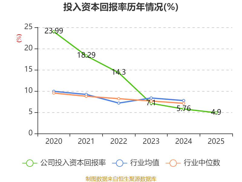 数据显示,2025年公司加权平均净资产收益率为5.1%,较上年同期下降1.04个百分点。公司2025年投入资本回报率为4.9%,较上年同期下降0.86个百分点。