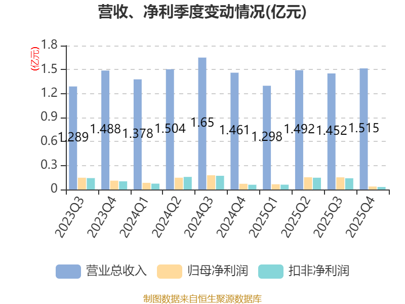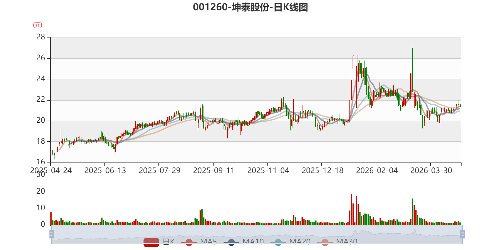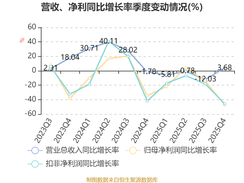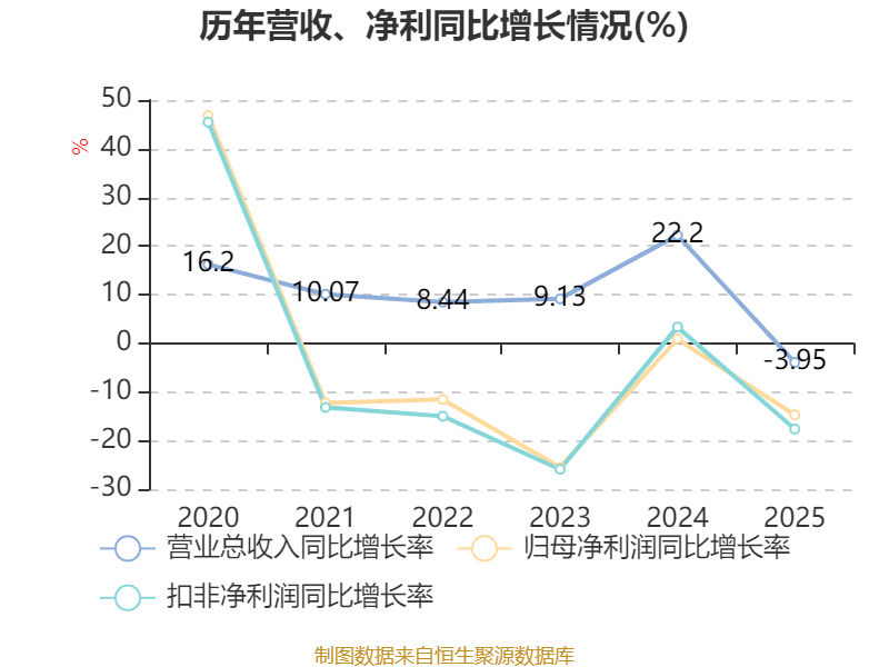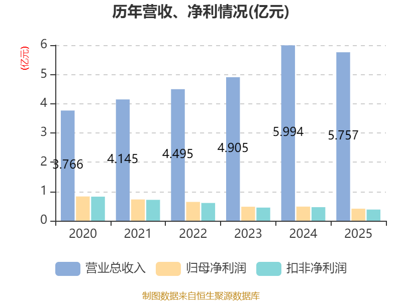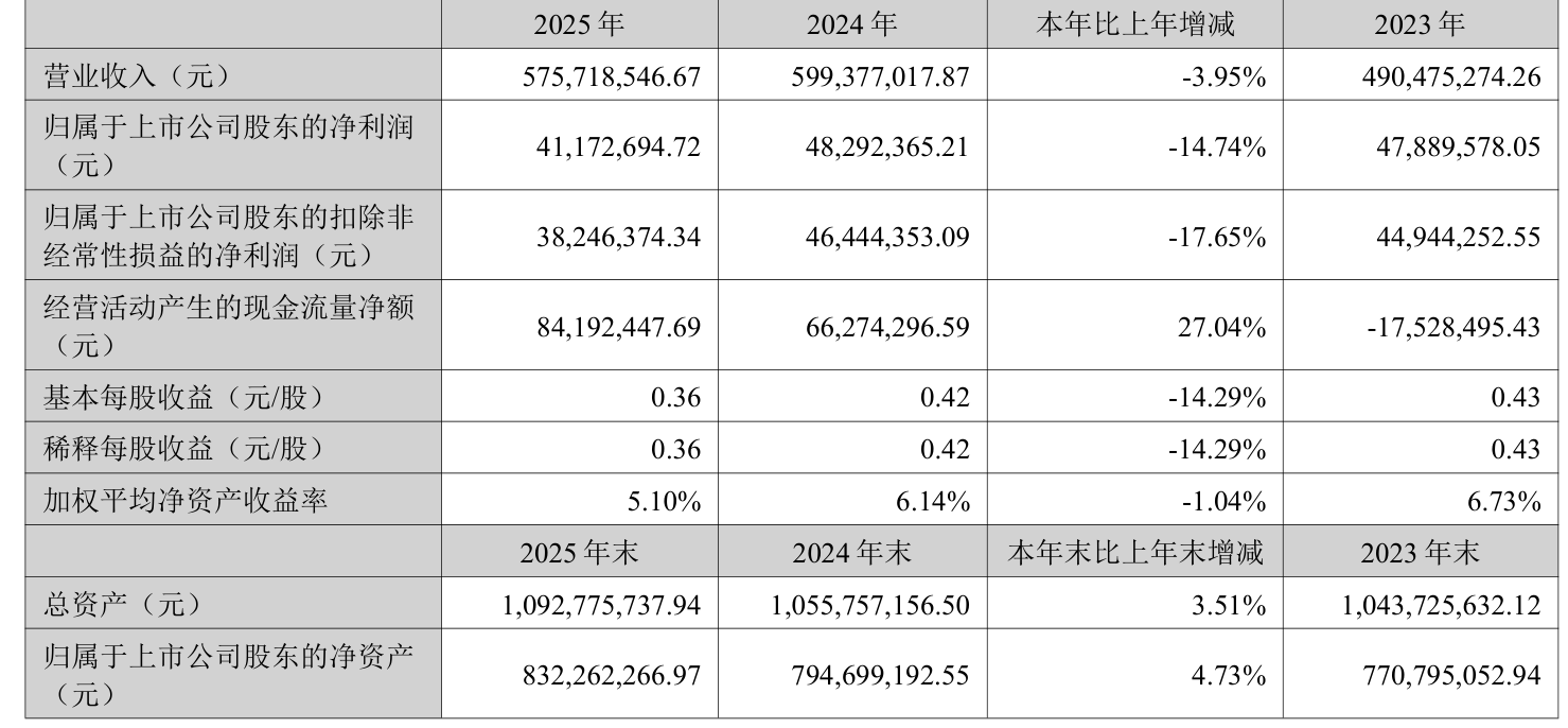 中证智能财讯坤泰股份(001260)4月24日披露2025年年度报告。2025年,公司实现营业总收入5.76亿元,同比下降3.95%;归母净利润4117.27万元,同比下降14.74%;扣非净利润3824.64万元,同比下降17.65%;经营活动产生的现金流量净额为8419.24万元,同比增长27.04%;报告期内,坤泰股份基本每股收益为0.36元,加权平均净资产收益率为5.10%。2025年利润分配预案为:拟向全体股东每10股派发现金红利2.15元(含税)。
