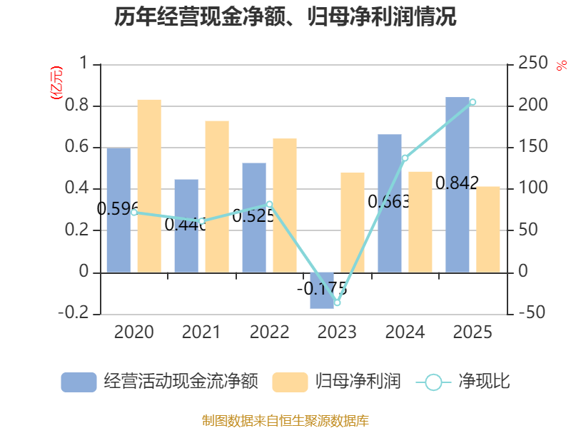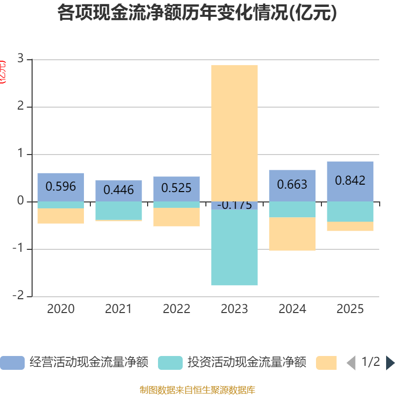 截至2025年,公司经营活动现金流净额为8419.24万元,同比增长27.04%;筹资活动现金流净额-1937.2万元,同比增加5065.06万元;投资活动现金流净额-4267.72万元,上年同期为-3370.03万元。