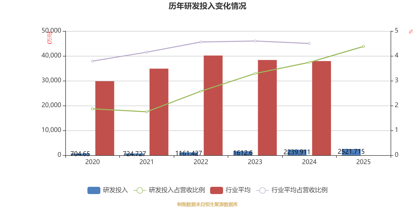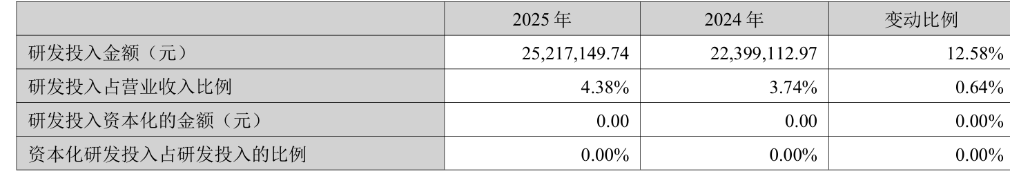 2025年全年,公司研发投入金额为2521.71万元,同比增长12.58%;研发投入占营业收入比例为4.38%,相比上年同期上升0.64个百分点。此外,公司全年研发投入资本化率为0%。