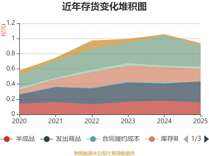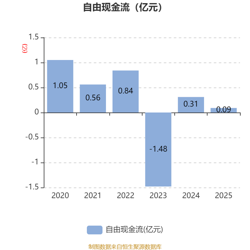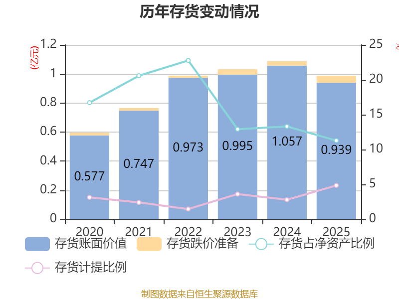 从存货变动来看,截至2025年末,公司存货账面价值为9390.26万元,占净资产的11.28%,较上年末减少1184.13万元。其中,存货跌价准备为479.05万元,计提比例为4.85%。