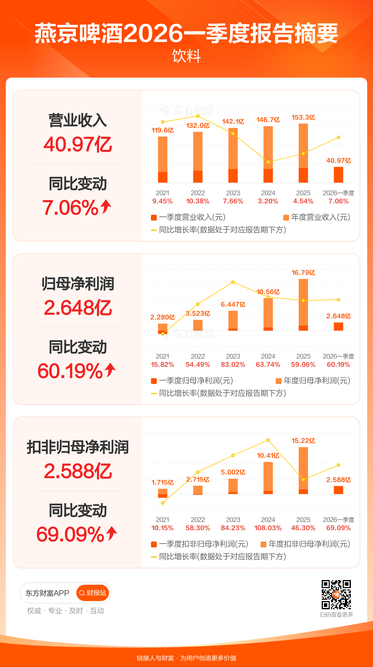 燕京啤酒4月24日发布2026年一季报显示,公司一季度实现营业收入40.97亿元,同比增长7.06%;归母净利润2.65亿元,同比增长60.19%;扣非归母净利润2.59亿元,同比增长69.09%。