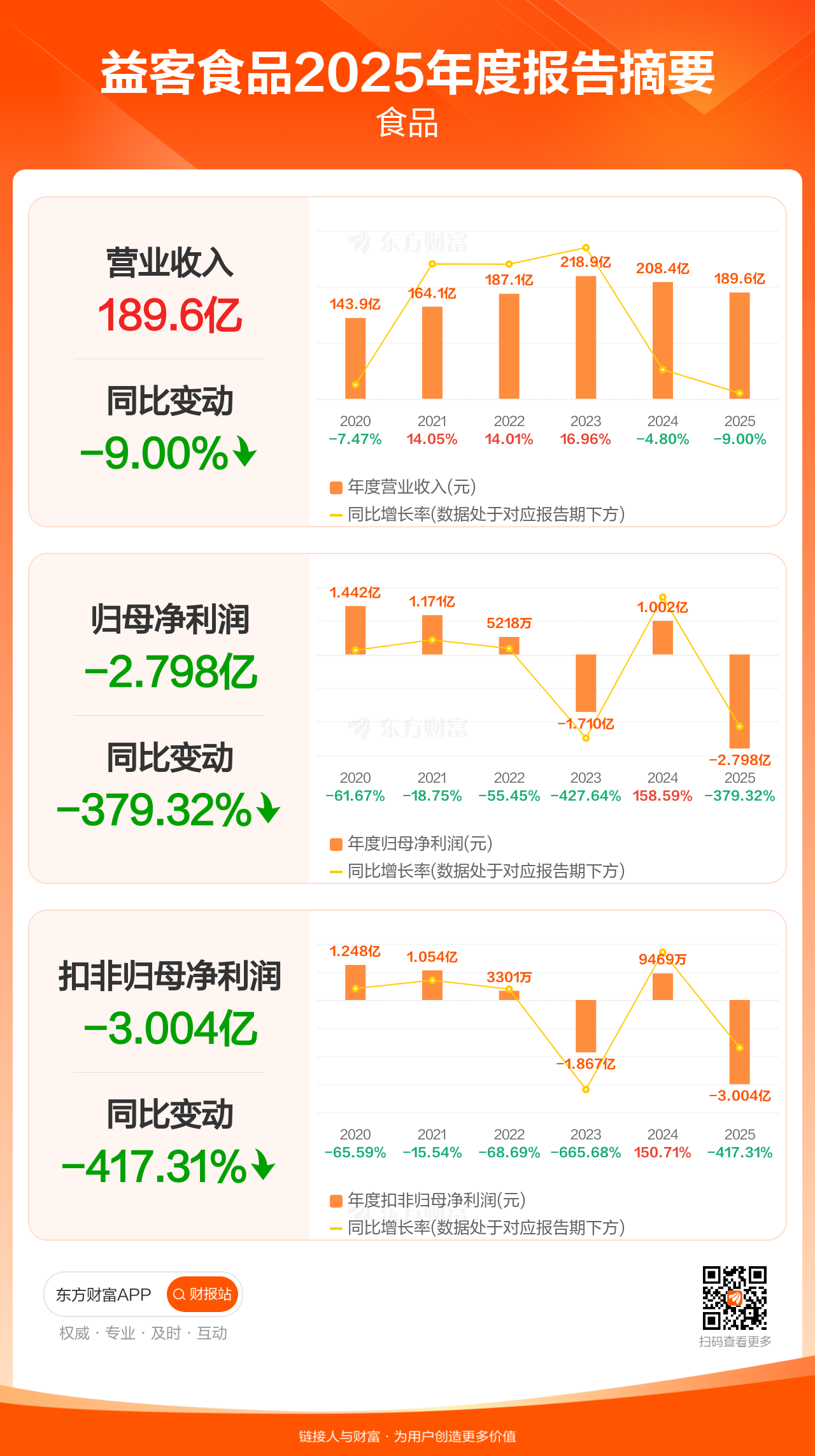 益客食品4月24日发布2025年年报显示,公司全年实现营业收入189.62亿元,同比下滑9.00%;归母净利润-2.80亿元;扣非归母净利润-3.00亿元。