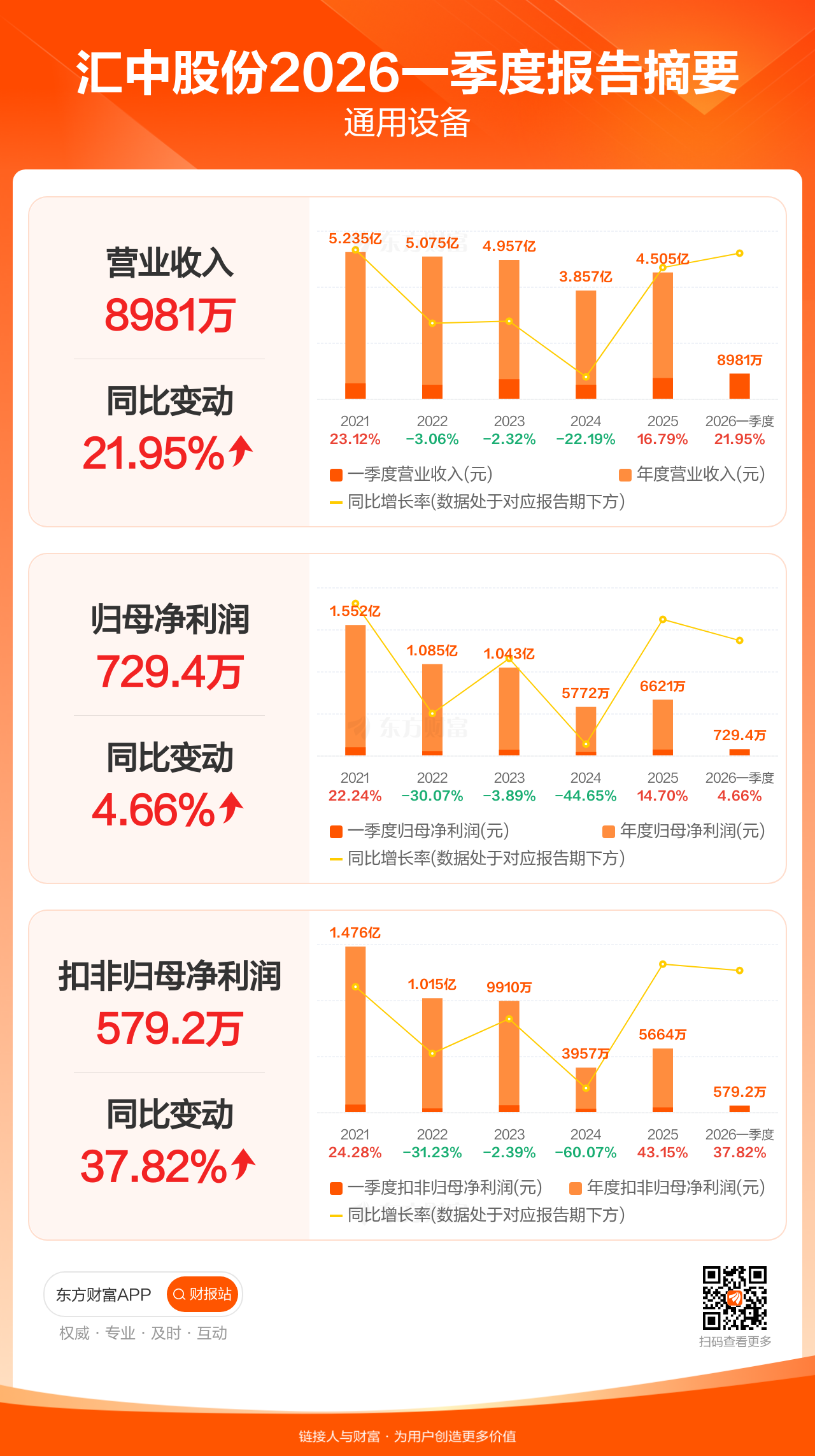 汇中股份4月24日发布2026年一季报显示,公司一季度实现营业收入8981.38万元,同比增长21.95%;归母净利润729.38万元,同比增长4.66%;扣非归母净利润579.22万元,同比增长37.82%。