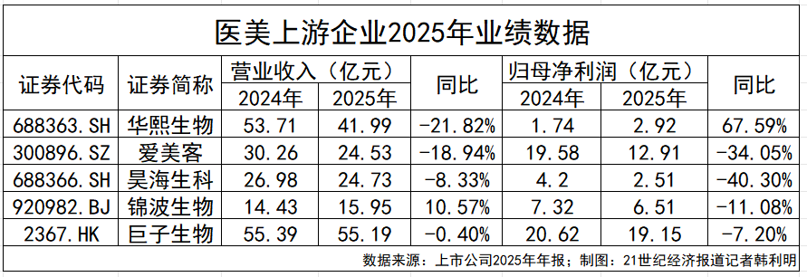 其中,华熙生物、昊海生科、爱美客作为在玻尿酸市场备受关注的“医美三剑客”,均遭遇不同程度的增长瓶颈。具体来看,2025年,华熙生物实现营业收入41.99亿元,同比下降21.82%,这已是其营收连续第三年下滑;同时,通过压缩销售和管理费用,同期归母净利润达2.92亿元,同比上涨67.59%。