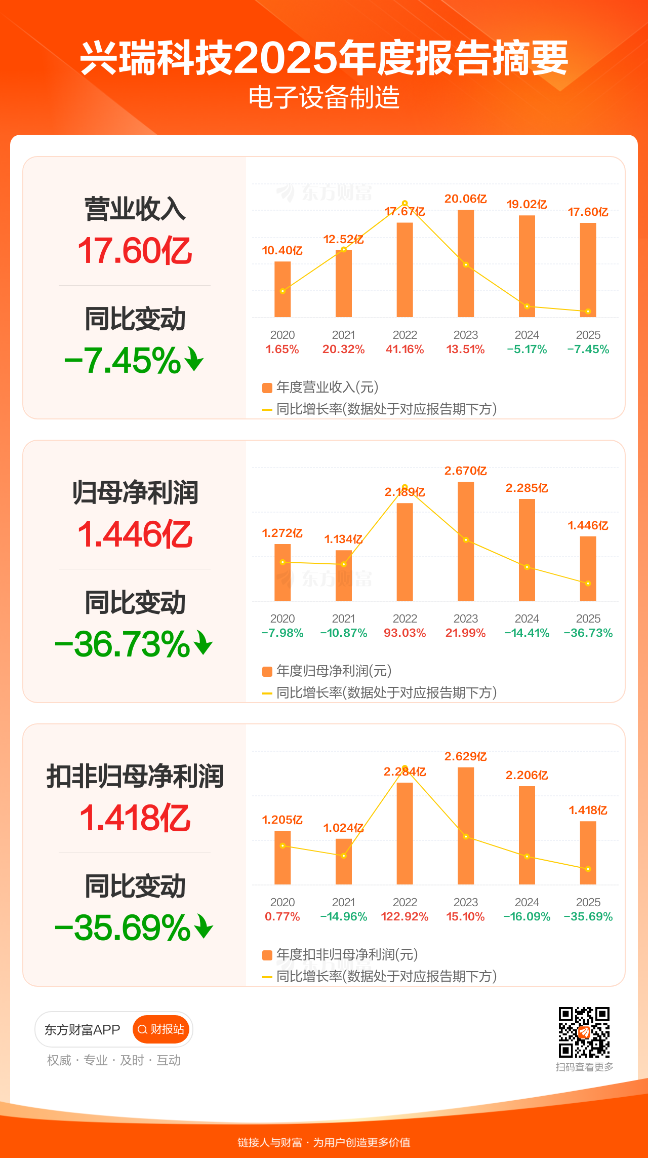 兴瑞科技4月24日发布2025年年报显示,公司全年实现营业收入17.60亿元,同比下滑7.45%;归母净利润1.45亿元,同比下滑36.73%;扣非归母净利润1.42亿元,同比下滑35.69%。