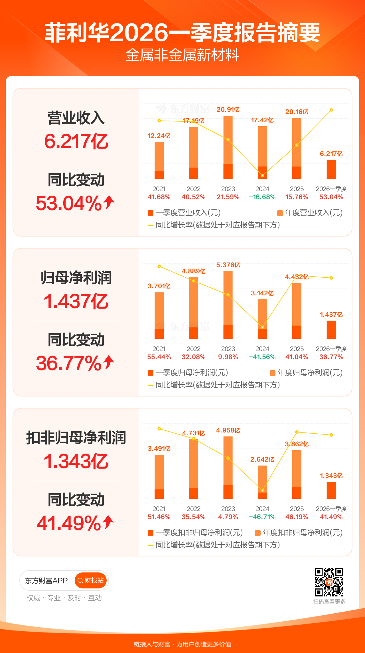 菲利华4月24日发布2026年一季报显示,公司一季度实现营业收入6.22亿元,同比增长53.04%;归母净利润1.44亿元,同比增长36.77%;扣非归母净利润1.34亿元,同比增长41.49%。
