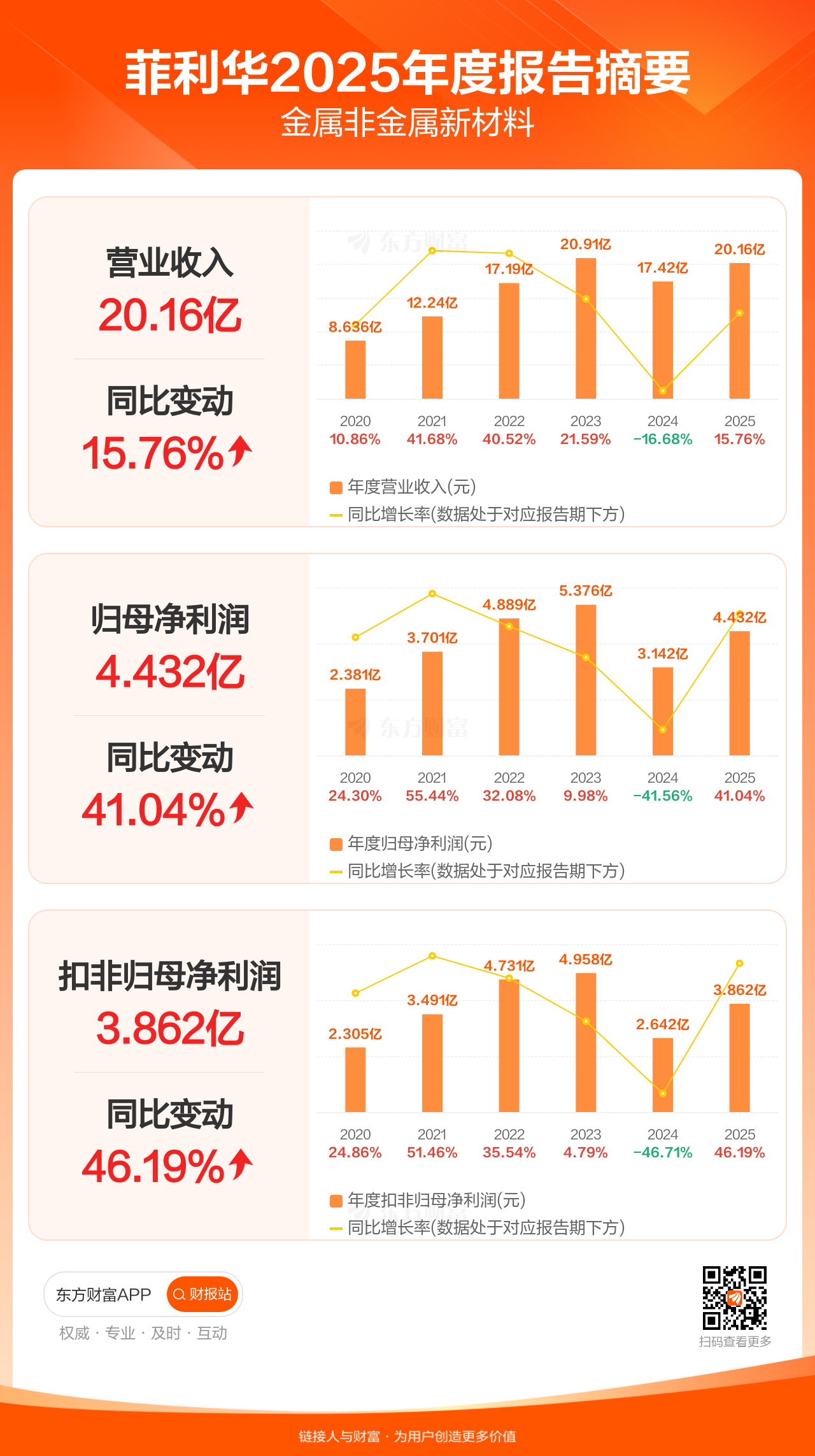 菲利华4月24日发布2025年年报显示,公司全年实现营业收入20.16亿元,同比增长15.76%;归母净利润4.43亿元,同比增长41.04%;扣非归母净利润3.86亿元,同比增长46.19%。