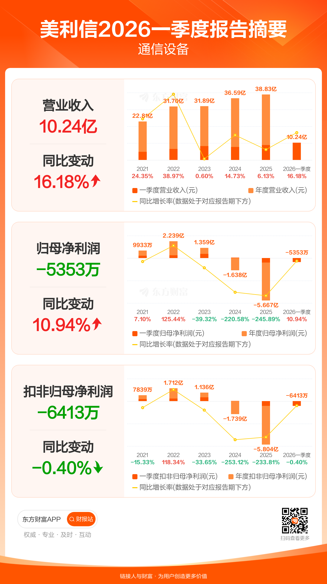 美利信4月24日发布2026年一季报显示,公司一季度实现营业收入10.24亿元,同比增长16.18%;归母净利润-5353.13万元;扣非归母净利润-6412.87万元。