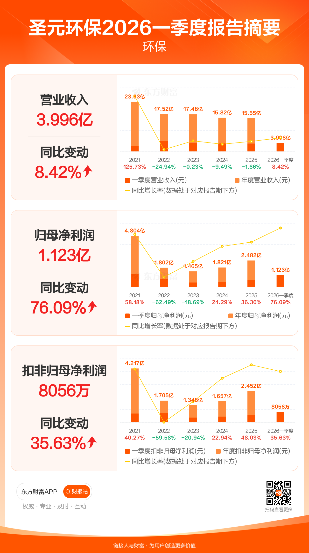 圣元环保4月24日发布2026年一季报显示,公司一季度实现营业收入4.00亿元,同比增长8.42%;归母净利润1.12亿元,同比增长76.09%;扣非归母净利润8056.22万元,同比增长35.63%。