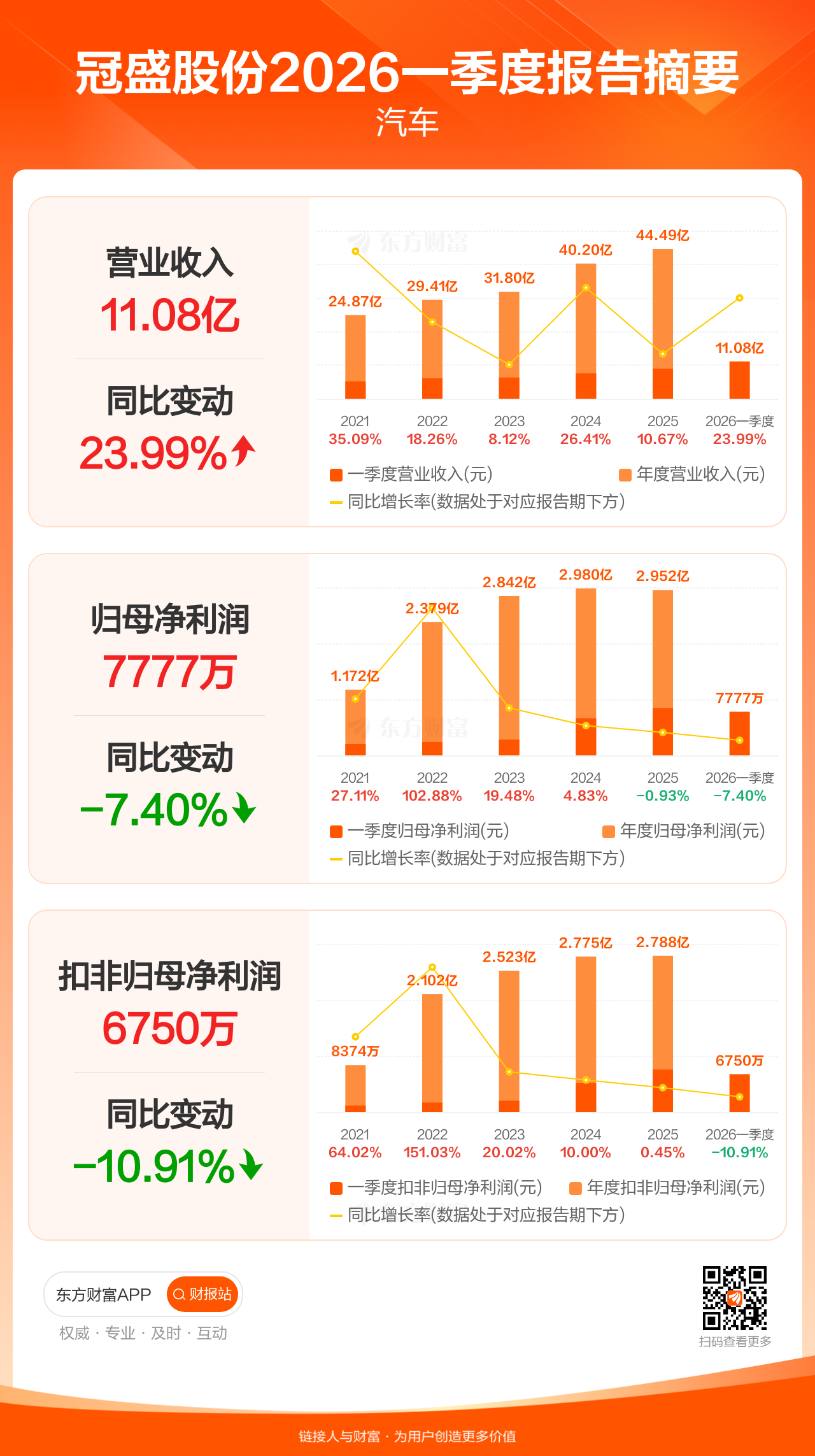 冠盛股份4月24日发布2026年一季报显示,公司一季度实现营业收入11.08亿元,同比增长23.99%;归母净利润7776.75万元,同比下滑7.40%;扣非归母净利润6749.93万元,同比下滑10.91%。