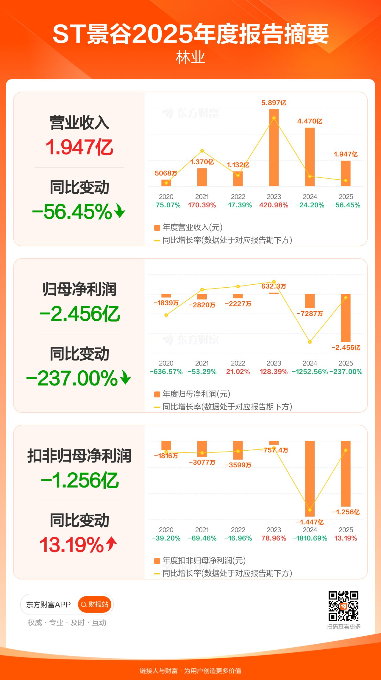 ST景谷4月24日发布2025年年报显示,公司全年实现营业收入1.95亿元,同比下滑56.45%;归母净利润-2.46亿元;扣非归母净利润-1.26亿元。