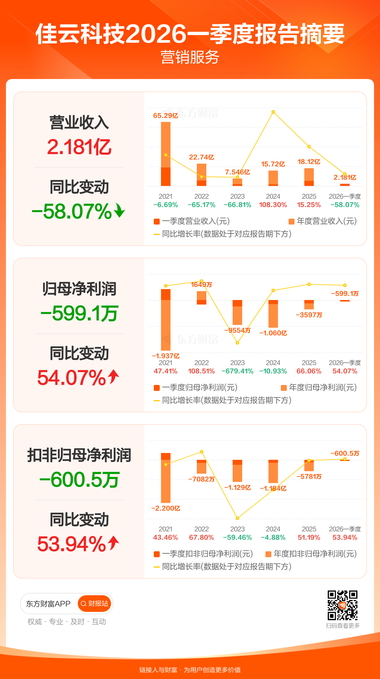 佳云科技4月24日发布2026年一季报显示,公司一季度实现营业收入2.18亿元,同比下滑58.07%;归母净利润-599.06万元;扣非归母净利润-600.46万元。