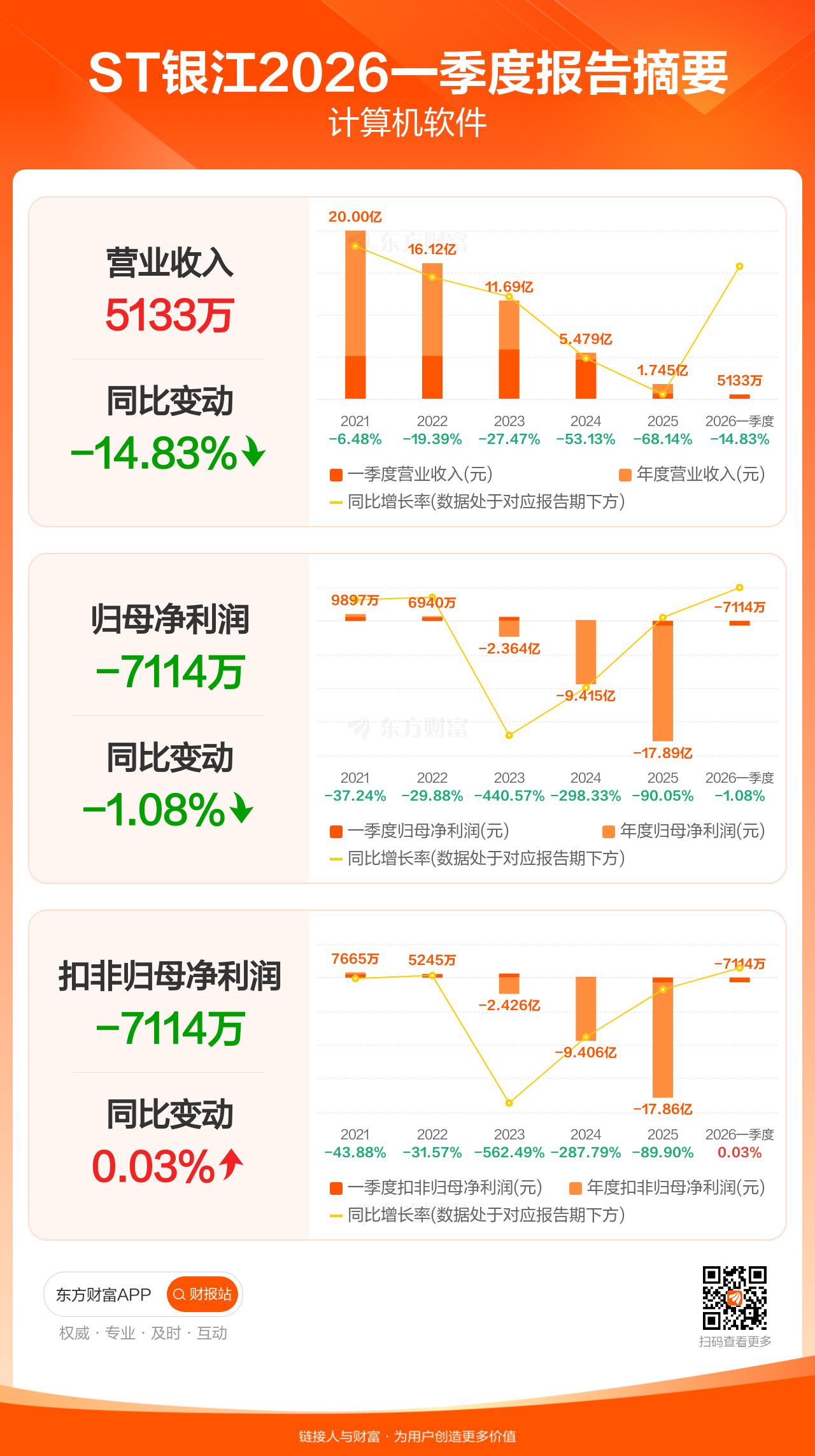 ST银江4月24日发布2026年一季报显示,公司一季度实现营业收入5132.92万元,同比下滑14.83%;归母净利润-7113.95万元;扣非归母净利润-7113.51万元。