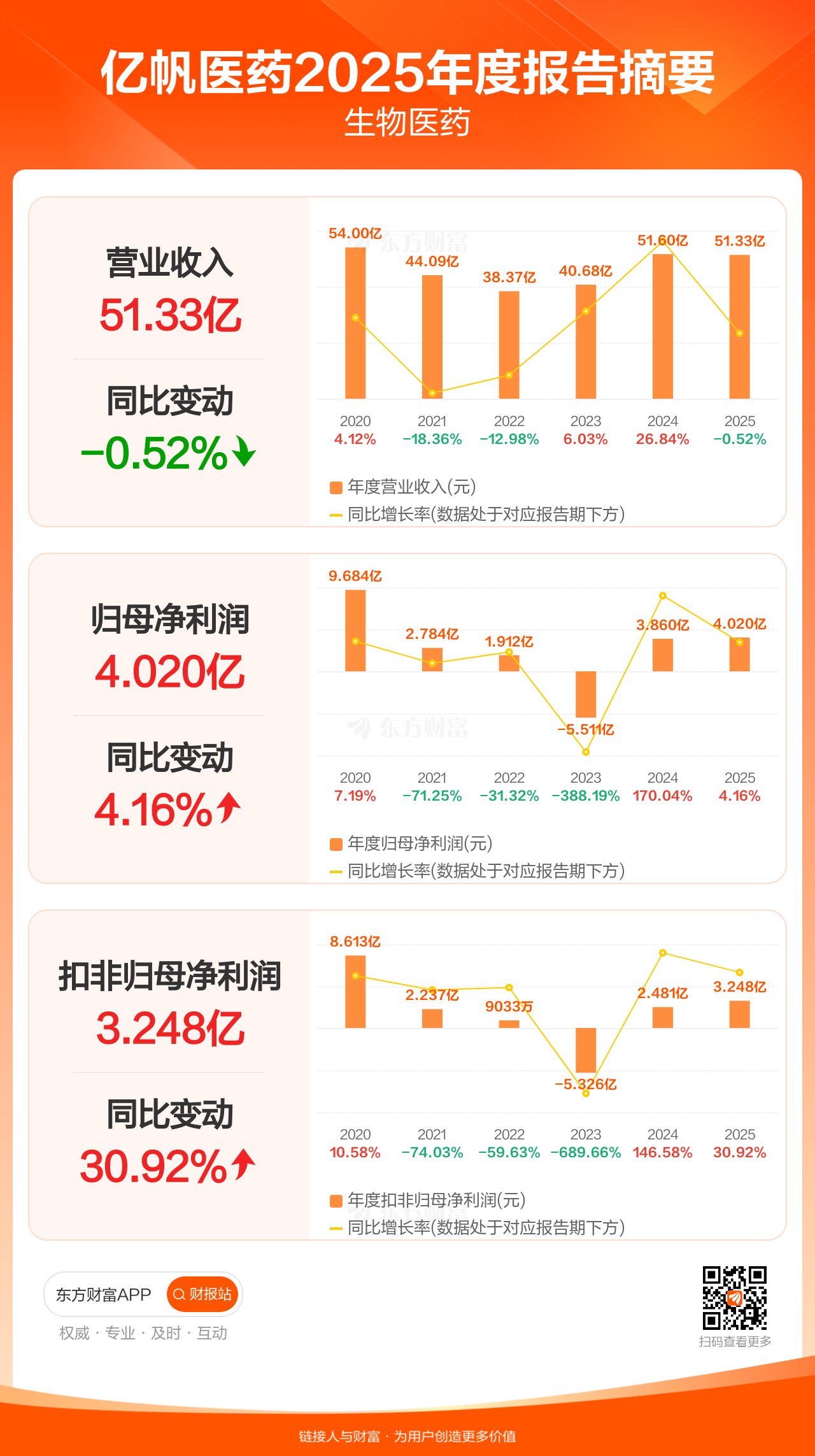亿帆医药4月24日发布2025年年报显示,公司全年实现营业收入51.33亿元,同比下滑0.52%;归母净利润4.02亿元,同比增长4.16%;扣非归母净利润3.25亿元,同比增长30.92%。