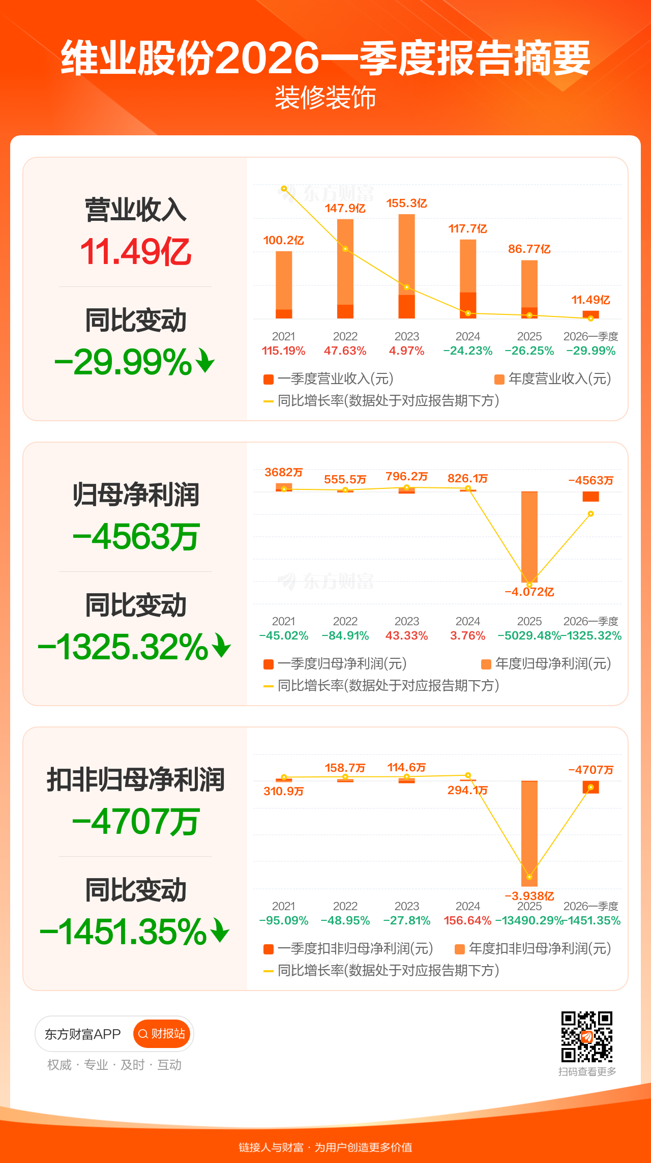 维业股份4月24日发布2026年一季报显示,公司一季度实现营业收入11.49亿元,同比下滑29.99%;归母净利润-4562.59万元;扣非归母净利润-4706.67万元。