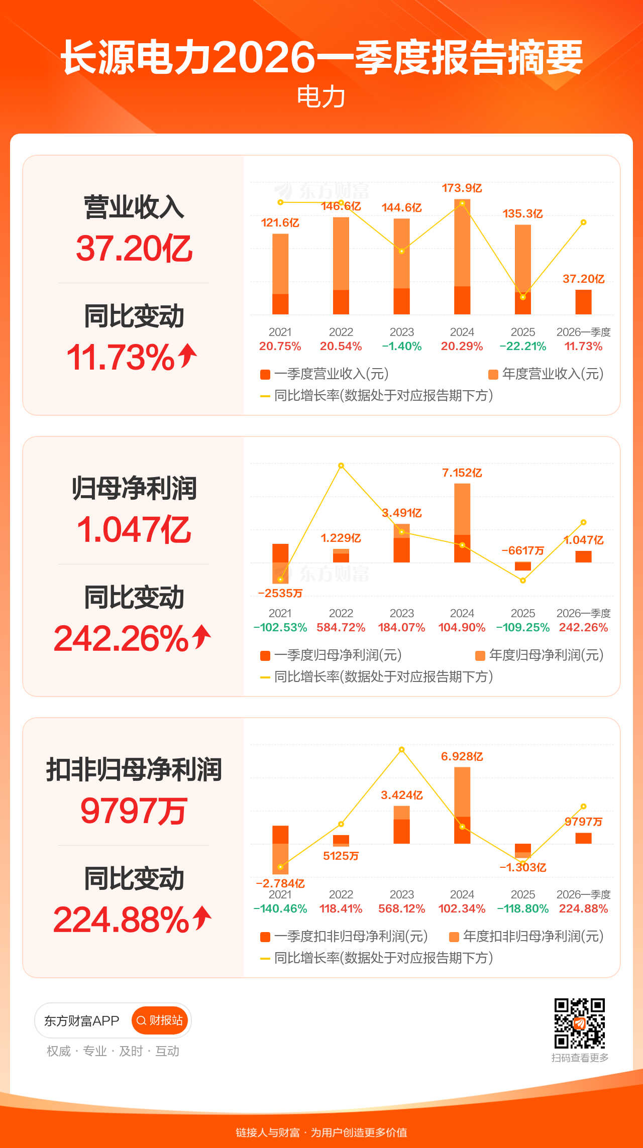 长源电力4月24日发布2026年一季报显示,公司一季度实现营业收入37.20亿元,同比增长11.73%;归母净利润1.05亿元,同比增长242.26%;扣非归母净利润9796.67万元,同比增长224.88%。