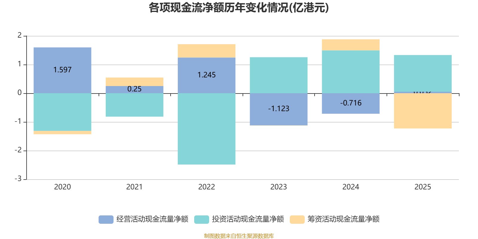2025年,公司经营活动现金流净额为517.9万港元,同比增加7674.4万港元;筹资活动现金流净额-1.23亿港元,同比减少1.61亿港元;投资活动现金流净额1.28亿港元,上年同期为1.5亿港元。