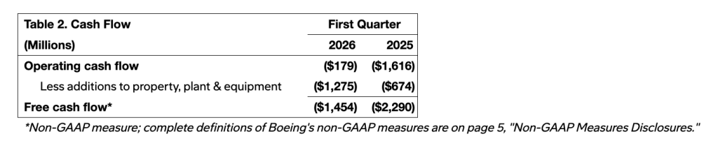 公司报告的经营现金流为-2亿美元,自由现金流(非GAAP)为-15亿美元,均有所好转。财报指出,这些业绩主要反映了更高的民用飞机交付量、运营绩效改善以及有利的订单时机。公司总储备订单达到创纪录的6950亿美元,三个业务板块均保持在历史高位。