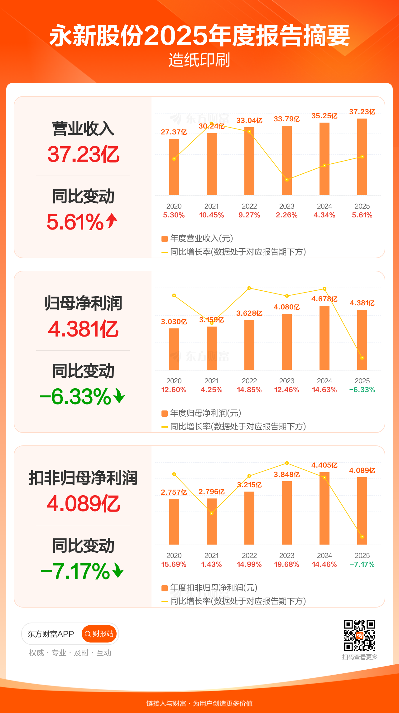 永新股份4月24日发布2025年年报显示,公司全年实现营业收入37.23亿元,同比增长5.61%;归母净利润4.38亿元,同比下滑6.33%;扣非归母净利润4.09亿元,同比下滑7.17%。