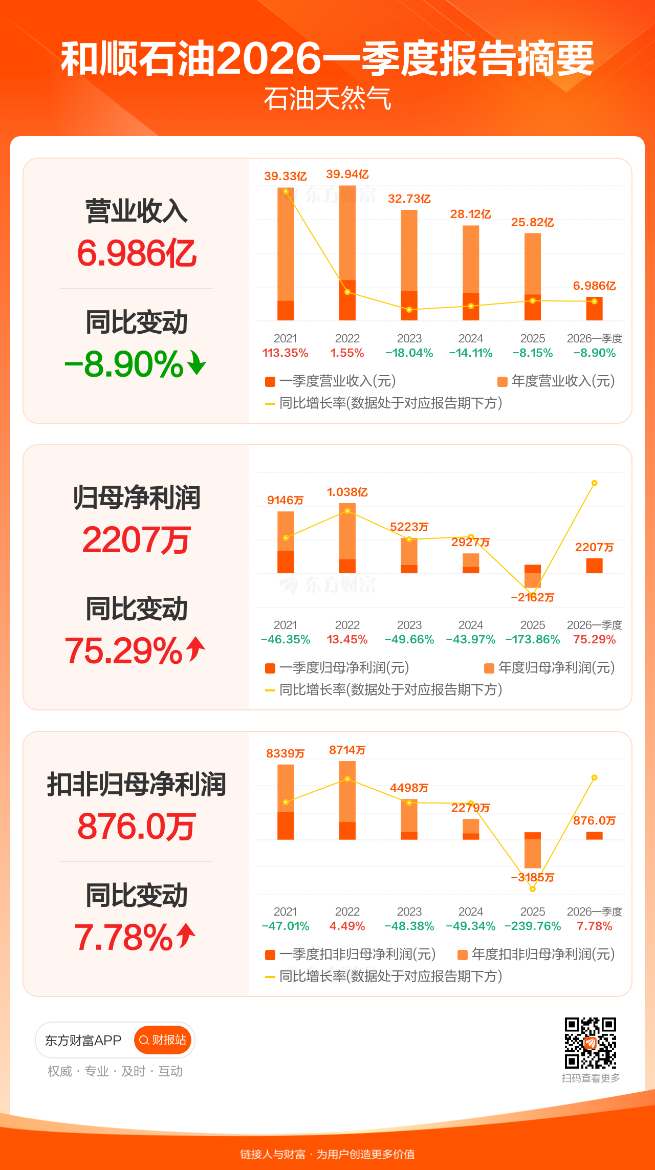和顺石油4月24日发布2026年一季报显示,公司一季度实现营业收入6.99亿元,同比下滑8.90%;归母净利润2206.97万元,同比增长75.29%;扣非归母净利润876.04万元,同比增长7.78%。