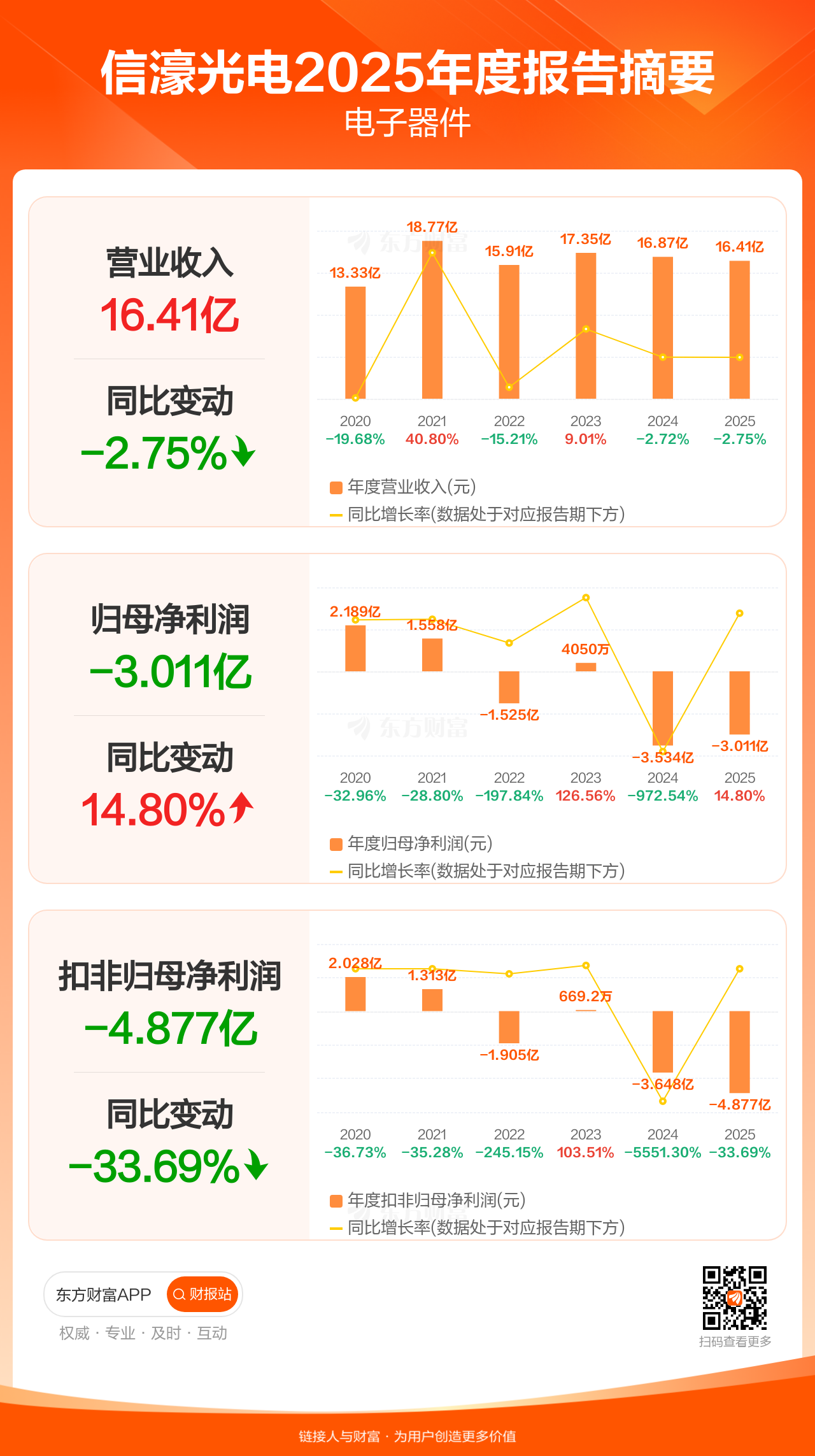 信濠光电4月24日发布2025年年报显示,公司全年实现营业收入16.41亿元,同比下滑2.75%;归母净利润-3.01亿元;扣非归母净利润-4.88亿元。
