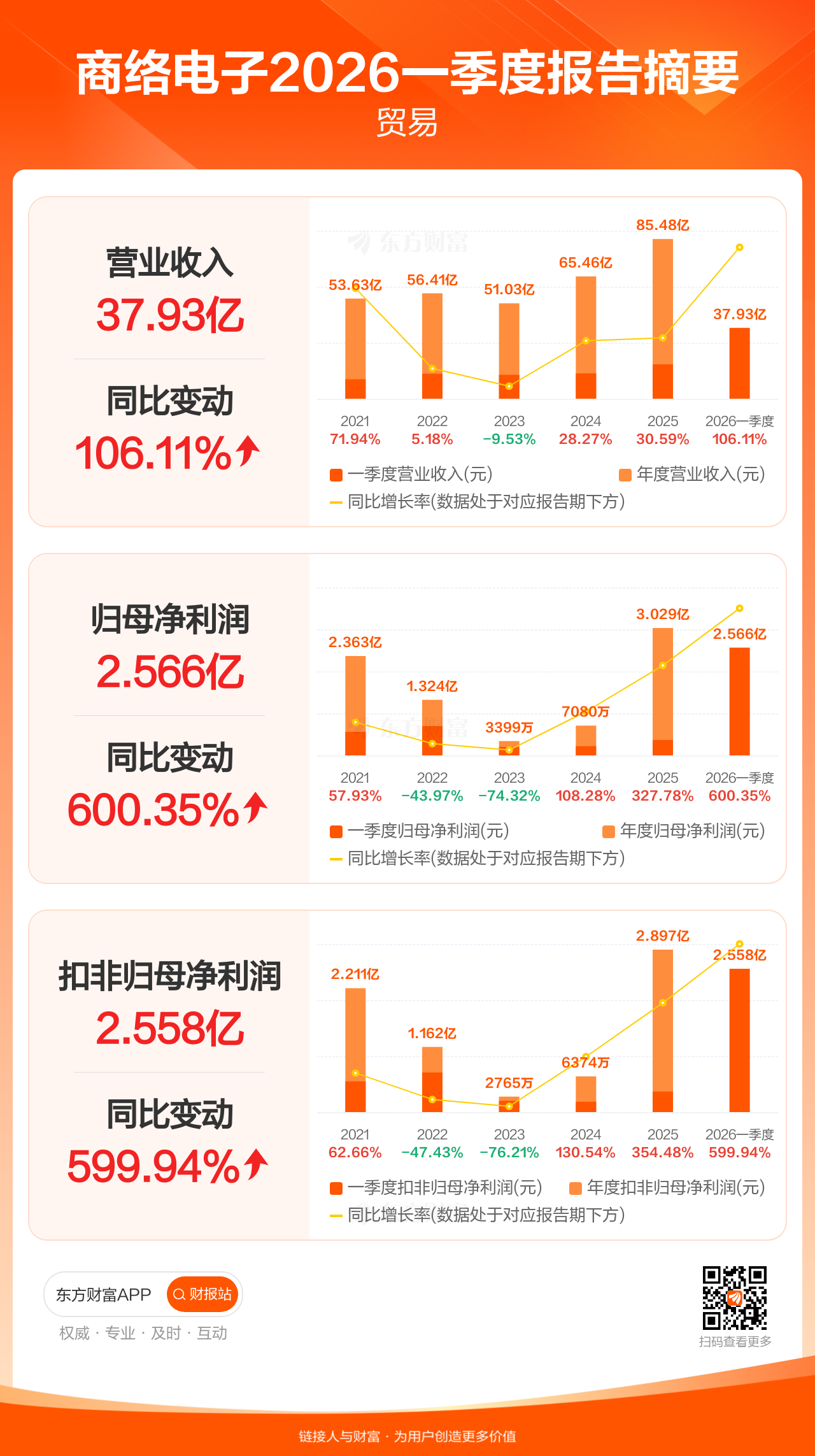 商络电子4月24日发布2026年一季报显示,公司一季度实现营业收入37.93亿元,同比增长106.11%;归母净利润2.57亿元,同比增长600.35%;扣非归母净利润2.56亿元,同比增长599.94%。