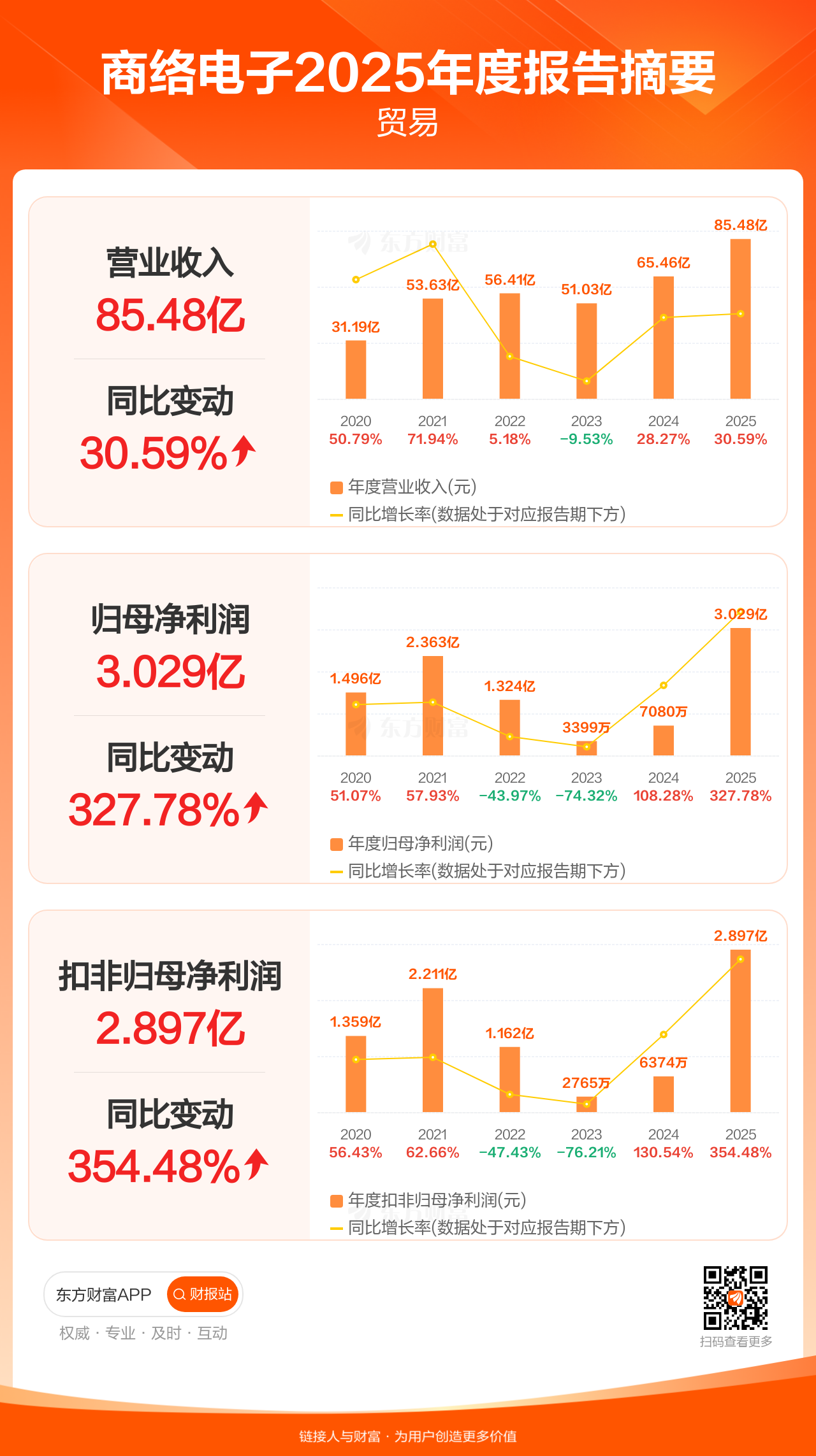 商络电子4月24日发布2025年年报显示,公司全年实现营业收入85.48亿元,同比增长30.59%;归母净利润3.03亿元,同比增长327.78%;扣非归母净利润2.90亿元,同比增长354.48%。