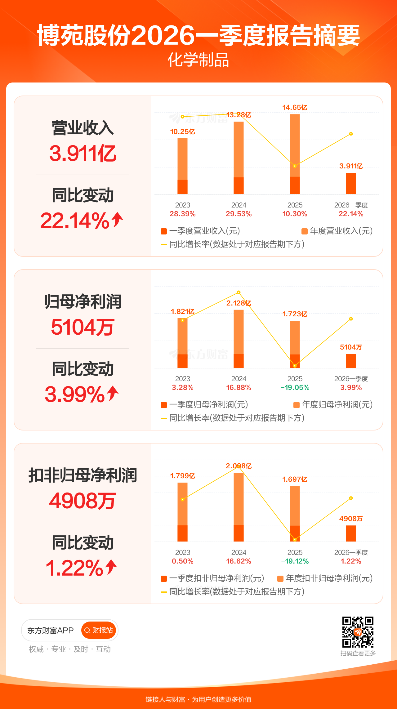 博苑股份4月24日发布2026年一季报显示,公司一季度实现营业收入3.91亿元,同比增长22.14%;归母净利润5103.63万元,同比增长3.99%;扣非归母净利润4908.12万元,同比增长1.22%。