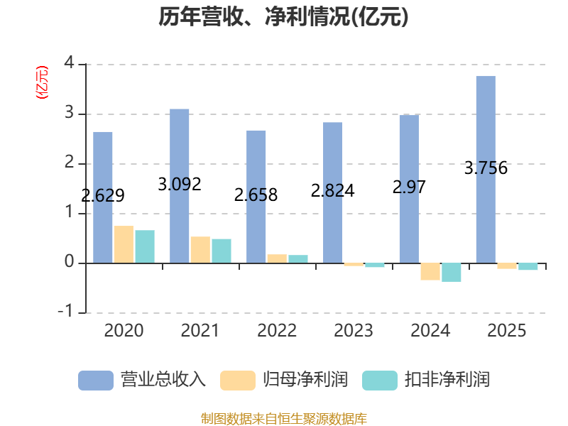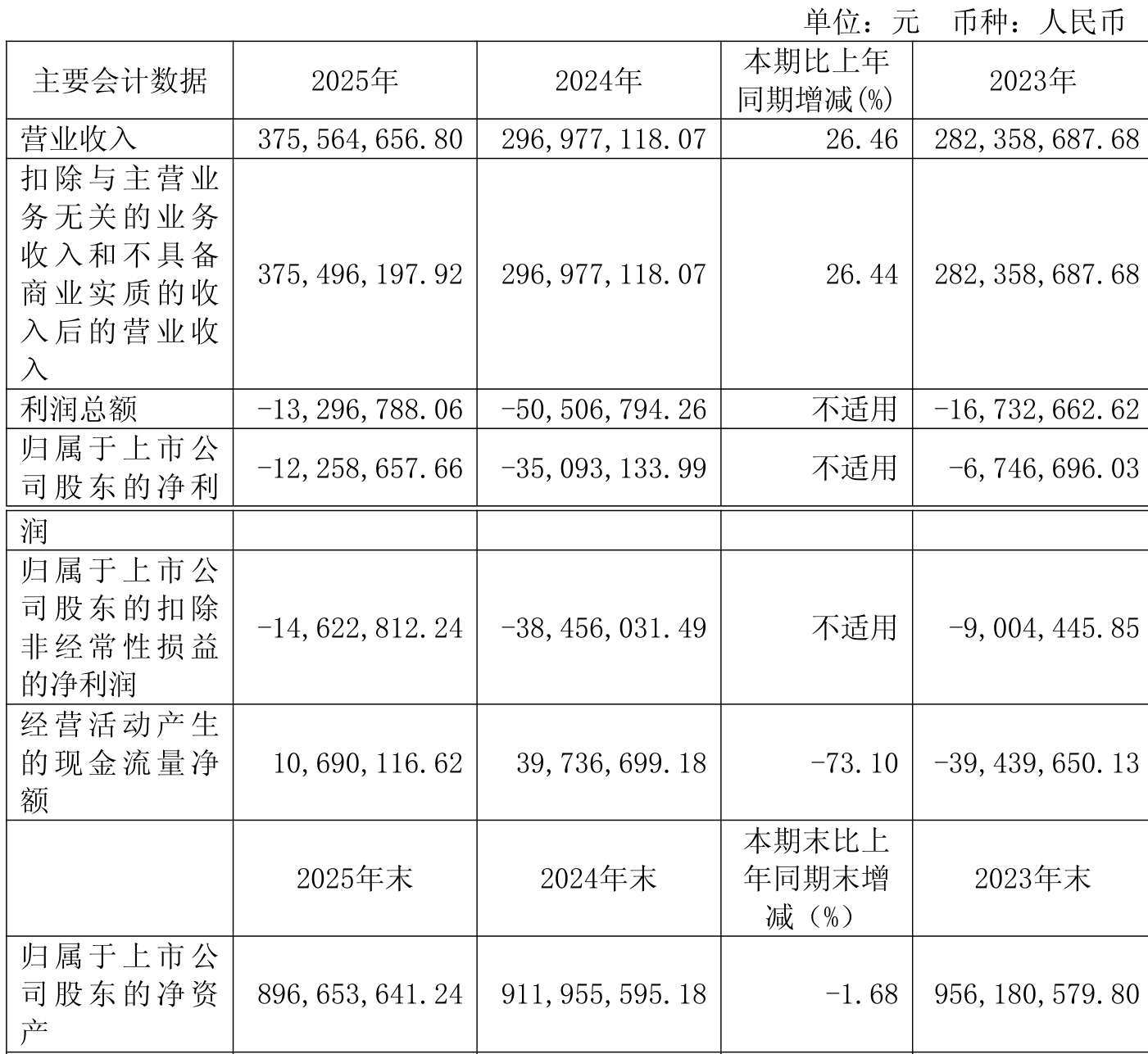 中证智能财讯云涌科技(688060)4月24日披露2025年年度报告。2025年,公司实现营业总收入3.76亿元,同比增长26.46%;归母净利润亏损1225.87万元,上年同期亏损3509.31万元;扣非净利润亏损1462.28万元,上年同期亏损3845.6万元;经营活动产生的现金流量净额为1069.01万元,同比下降73.10%;报告期内,云涌科技基本每股收益为-0.2048元,加权平均净资产收益率为-1.35%。