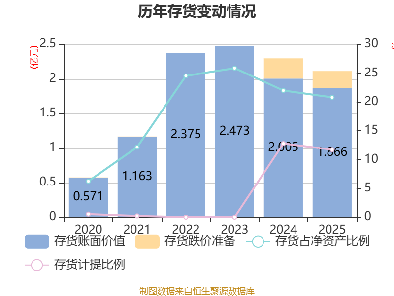 从存货变动来看,截至2025年末,公司存货账面价值为1.87亿元,占净资产的20.81%,较上年末减少1389.08万元。其中,存货跌价准备为2474.45万元,计提比例为11.71%。