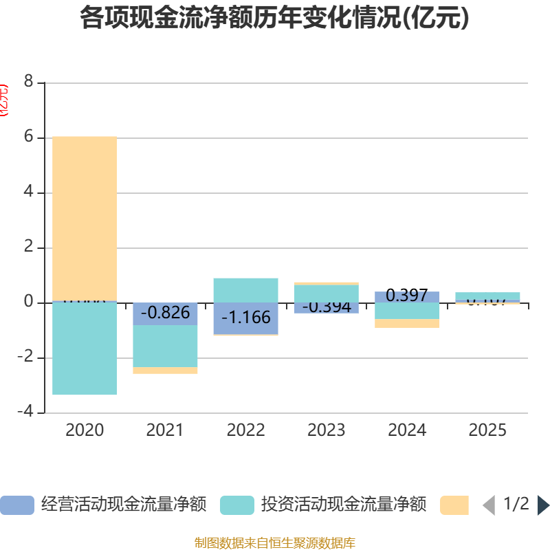 截至2025年,公司经营活动现金流净额为1069.01万元,同比下降73.1%;筹资活动现金流净额-684.63万元,同比增加2489.06万元;投资活动现金流净额2654.55万元,上年同期为-6064.45万元。