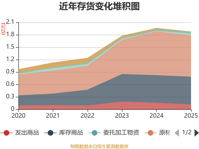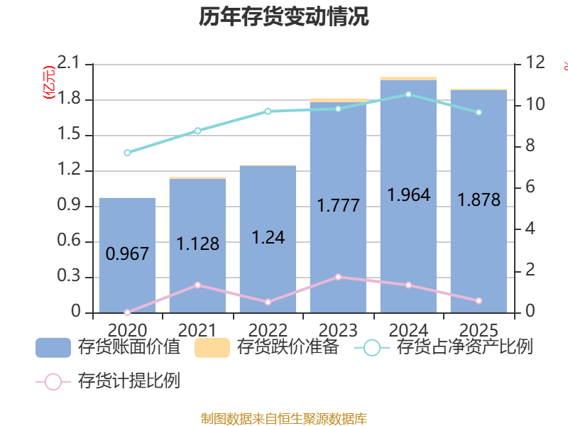 从存货变动来看,截至2025年末,公司存货账面价值为1.88亿元,占净资产的9.66%,较上年末减少863.17万元。其中,存货跌价准备为105.58万元,计提比例为0.56%。