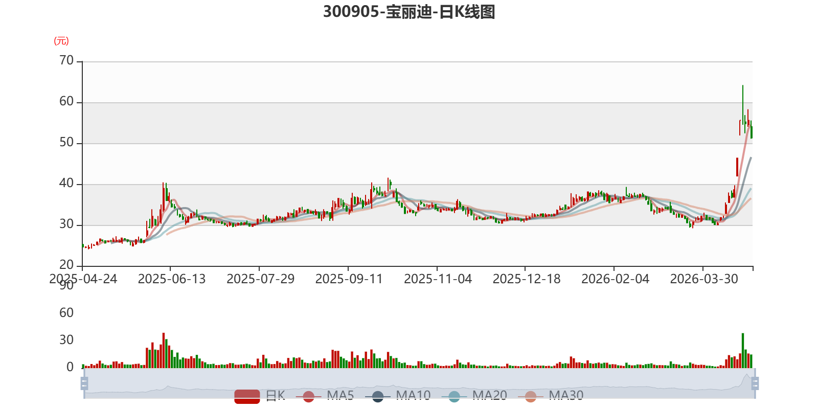 以4月23日收盘价计算,宝丽迪目前市盈率(TTM)约为60.69倍,市净率(LF)约4.73倍,市销率(TTM)约6.18倍。