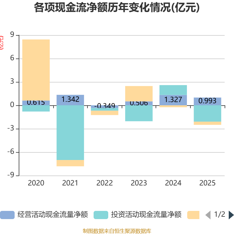 截至2025年,公司经营活动现金流净额为9928.87万元,同比下降25.2%;筹资活动现金流净额-4083.91万元,同比减少1626.06万元;投资活动现金流净额-2.1亿元,上年同期为1.26亿元。
